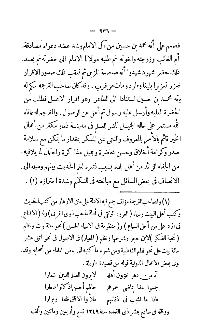 فصمم على أَنه مُحَمَّد بن حُسَيْن من آل الإمام وَشد عضد دَعْوَاهُ مصادقة أم الْغَائِب وَزَوجته وأخوته ثمَّ طلبه مَوْلَانَا الإمام إلى حَضرته ثمَّ بعد ذَلِك حضر شُهُود شهدُوا أَنه صعصعة المزين ثمَّ تعقب ذَلِك صُدُور الاقرار فعزر تعزيرا بليغاً وطرد وَمَات عَن قرب وَقد كَانَ صَاحب الترجمة حكم لَهُ بأنه مُحَمَّد بن حُسَيْن استناداً إلى الظَّاهِر وَهُوَ إقرار الأهل فَطلب من الحضرة العلية وَأرْسل عَلَيْهِ رَسُول ثمَّ أعفي عَن الْوُصُول والمترجم لَهُ عافاه الله مُسْتَمر على حَاله الْجَمِيل ناشر للْعلم في مَدِينَة ذمار مكثر من أَعمال الْخَيْر قَائِم بِالْأَمر بِالْمَعْرُوفِ والنهي عَن الْمُنكر بِمِقْدَار مَا يُمكن مَعَ سَلامَة صدر وكرامة أَخْلَاق وَحسن محاضرة وجمييل مذاكرة وَاحْتِمَال لما يلاقيه من الْجفَاء الزَّائِد من أهل بَلَده بِسَبَب نشره لعلم الحَدِيث بَينهم وميله إلى الإنصاف في بعض الْمسَائِل مَعَ مبالغته في التكتم وَشدَّة احترازه