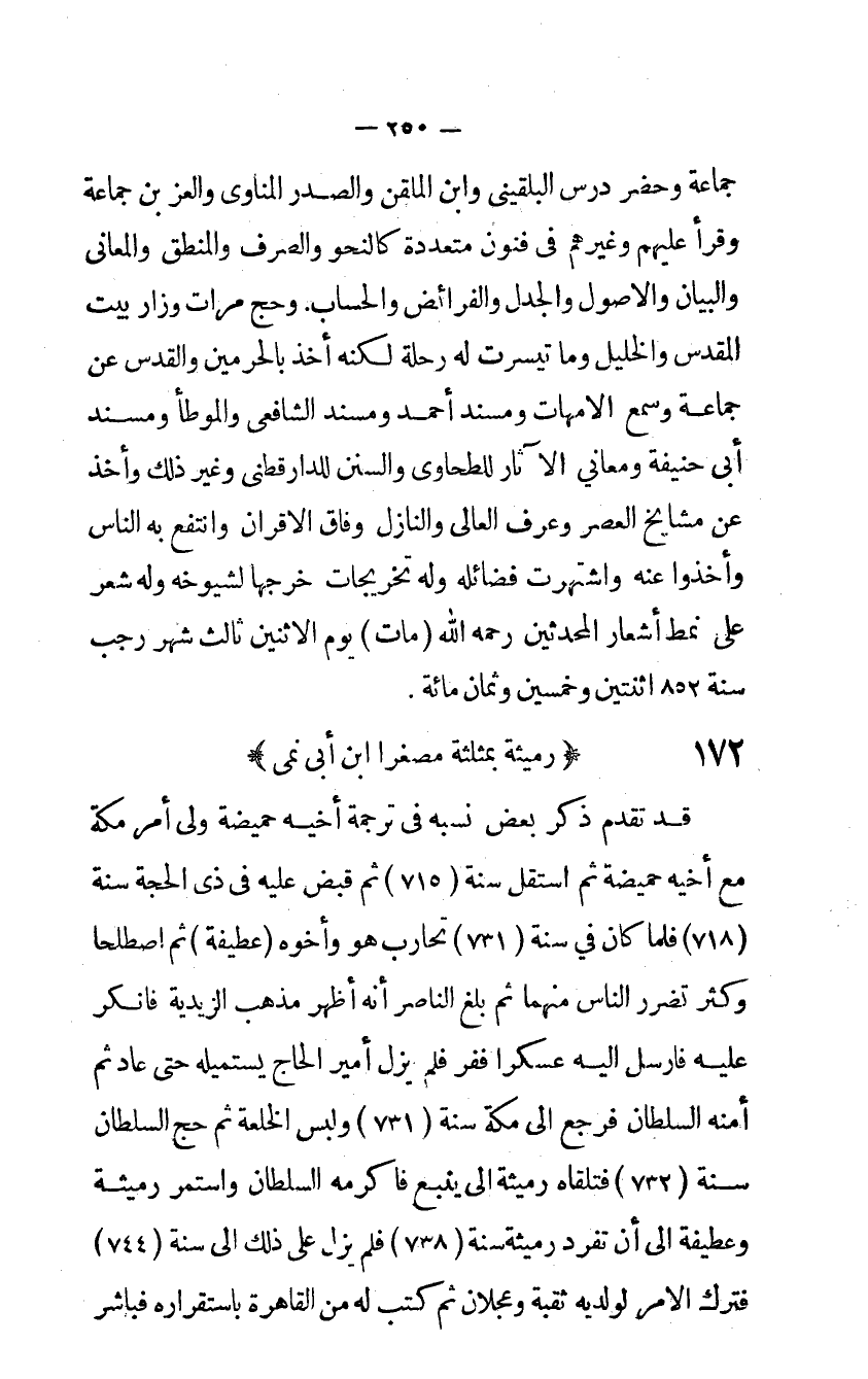 جمَاعَة وَحضر درس البلقيني وَابْن الملقن والصدر المناوى والعز ين جمَاعَة وَقَرَأَ عَلَيْهِم وَغَيرهم في فنون مُتعَدِّدَة كالنحو وَالصرْف والمنطق والمعاني وَالْبَيَان والأصول والجدل والفرائض والحساب وَحج مَرَّات وزار بَيت الْمُقَدّس والخليل وَمَا تيسرت لَهُ رحْلَة لكنه أخذ بالحرمين والقدس عَن جمَاعَة وَسمع الأمهات ومسند أَحْمد ومسند الشافعي والموطأ ومسند أَبى حنيفَة ومعاني الْآثَار للطحاوي وَالسّنَن للدَّار قطني وَغير ذَلِك وَأخذ عَن مَشَايِخ الْعَصْر وَعرف العالي والنازل وفَاق الأقران وانتفع بِهِ النَّاس وَأخذُوا عَنهُ واشتهرت فضائله وَله تخرجات خرّجها لشيوخه وَله شعر على نمط أشعار الْمُحدثين رَحمَه الله مَاتَ يَوْم الِاثْنَيْنِ ثَالِث شهر رَجَب سنة 852 اثْنَتَيْنِ وَخمسين وثمان مائَة