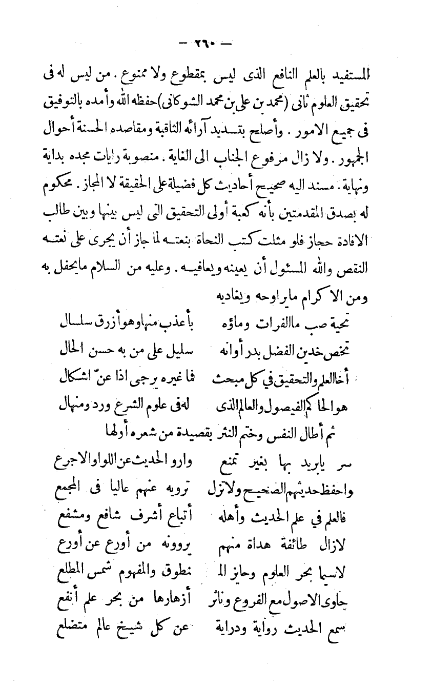 المستفيد بِالْعلمِ النافع الَّذِي لَيْسَ بمقطوع وَلَا مَمْنُوع من لَيْسَ لَهُ في تَحْقِيق الْعُلُوم ثاني مُحَمَّد بن علي بن مُحَمَّد الشوكاني حفظه الله وأمده بالتوفيق في جَمِيع الأمور وَأصْلح بتسديد آرائه الثاقبة ومقاصده الْحَسَنَة أَحْوَال الْجُمْهُور وَلَا زَالَ مَرْفُوع الجناب إلى الْغَايَة مَنْصُوبَة رايات مجده بداية وَنِهَايَة مُسْند إليه صَحِيح أَحَادِيث كل فَضِيلَة على الْحَقِيقَة لَا الْمجَاز مَحْكُوم لَهُ بِصدق المقدمتين بِأَنَّهُ كعبة أولي التَّحْقِيق الَّتِى لَيْسَ بَينهَا وَبَين طَالب الإفادة حجاز فَلَو مثلت كتب النُّحَاة بنعته لما جَازَ أَن يجري على نَعته النَّقْص وَالله الْمَسْئُول أَن يُعينهُ ويعافيه وَعَلِيهِ من السَّلَام مَا يحفل بِهِ وَمن الإكرام مَا يراوحه ويغاديه