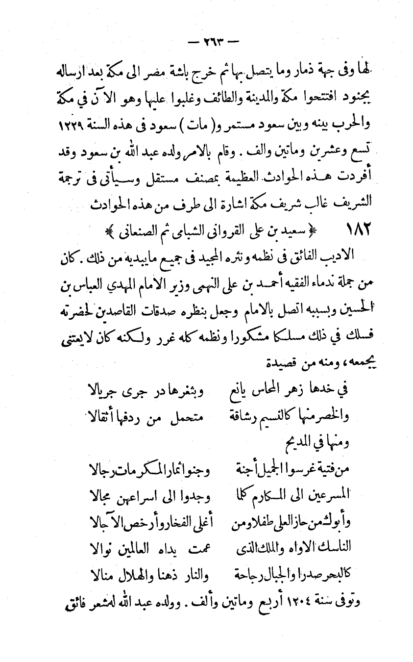 وَلها وفى جِهَة ذمّار وَمَا يتَّصل بهَا ثمَّ خرج باشة مصر إلى مَكَّة بعد إرساله بِجُنُود افتتحوا مَكَّة وَالْمَدينَة والطائف وغلبوا عَلَيْهَا وَهُوَ الآن فِي مَكَّة وَالْحَرب بَينه وَبَين سعود مُسْتَمر وَمَات سعود في هَذِه السنة 1229 تسع وَعشْرين وماتين وألف وَقَامَ بالأمر وَلَده عبد الله بن سعود وَقد أفردت هَذِه الْحَوَادِث الْعَظِيمَة بمصنف مُسْتَقل وسيأتي في تَرْجَمَة الشريف غَالب شرِيف مَكَّة إشارة إلى طرف من هَذِه الْحَوَادِث