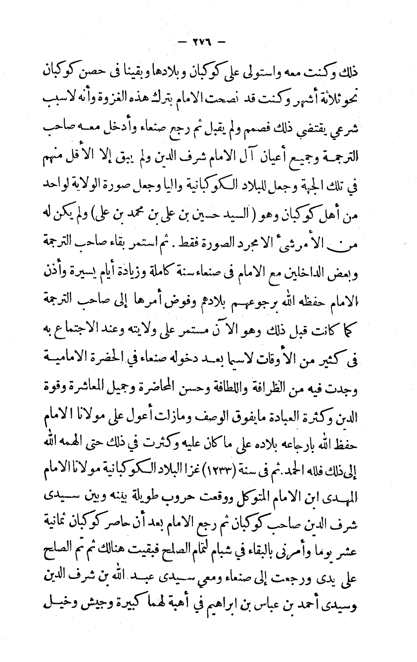 ذَلِك وَكنت مَعَه وَاسْتولى على كوكبان وبلادها وَبَقينَا في حصن كوكبان نَحْو ثَلَاثَة أشهر وَكنت قد نصحت الإمام بترك هَذِه الْغَزْوَة وأنه لَا سَبَب شَرْعِي يقتضي ذَلِك فصمم وَلم يقبل ثمَّ رَجَعَ صنعاء وَأدْخل مَعَه صَاحب التَّرْجَمَة وَجَمِيع أَعْيَان آل الإمام شرف الدَّين وَلم يبْق إِلَّا الْأَقَل مِنْهُم فِي تِلْكَ الْجِهَة وَجعل للبلاد الكوكبانية والياً وَجعل صُورَة الْولَايَة لوَاحِد من أهل كوكبان وَهُوَ السَّيِّد حُسَيْن بن علي بن مُحَمَّد بن علي وَلم يكن لَهُ من الْأَمر شئ إلا مُجَرّد الصُّورَة فَقَط ثمَّ اسْتمرّ بَقَاء صَاحب التَّرْجَمَة وَبَعض الداخلين مَعَ الإمام في صنعاء سنة كَامِلَة وَزِيَادَة أَيَّام يسيرَة وَأذن الإمام حفظه الله برجوعهم بِلَادهمْ وفوض أمرهَا إِلَى صَاحب التَّرْجَمَة كَمَا كَانَت قبل ذَلِك وَهُوَ الآن مُسْتَمر على ولَايَته وَعند الِاجْتِمَاع بِهِ فى كثير من الْأَوْقَات لَا سِيمَا بعد دُخُوله صنعاء فِي الحضرة الإمامية وجدت فِيهِ من الظرافة واللطافة وَحسن المحاضرة وَجَمِيل المعاشرة وَقُوَّة الدَّين وَكَثْرَة الْعِبَادَة مَا يفوق الْوَصْف وَمَا زلت أعول على مَوْلَانَا الإمام حفظ الله بإرجاعه بِلَاده على مَا كَانَ عَلَيْهِ وَكَثُرت فِي ذَلِك حَتَّى ألهمه الله إِلَى ذَلِك فَللَّه الْحَمد ثمَّ في سنة 1233 غزا الْبِلَاد الكوكبانية مَوْلَانَا الامام المهدى ابْن الامام المتَوَكل وَوَقعت حروب طَوِيلَة بَينه وَبَين سيدي شرف الدَّين صَاحب كوكبان ثمَّ رَجَعَ الإمام بعد أَن حاصر كوكبان ثَمَانِيَة عشر يَوْمًا وأمرني بِالْبَقَاءِ فِي شبام لتَمام الصُّلْح فَبَقيت هُنَالك ثمَّ تمّ الصُّلْح على يدي وَرجعت إِلَى صنعاء وَمَعِي سيدي عبد الله بن شرف الدَّين وسيدي أَحْمد بن عَبَّاس بن إبراهيم فِي أهبة لَهما كَبِيرَة وجيش وخيل