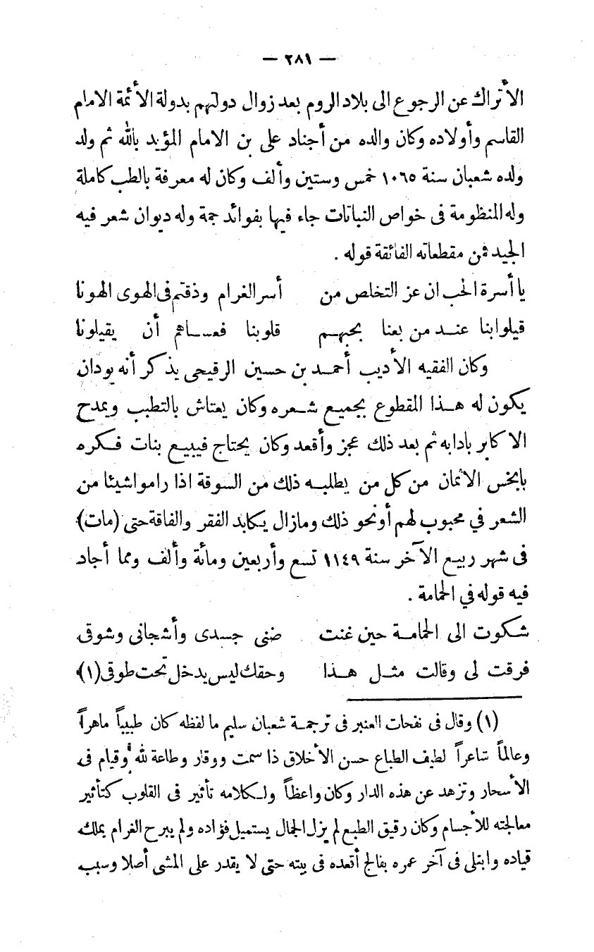 الأتراك عَن الرُّجُوع إلى بِلَاد الروم بعد زَوَال دولتهم بدولة الْأَئِمَّة الإمام الْقَاسِم وَأَوْلَاده وَكَانَ وَالِده من أجناد علي بن الإمام الْمُؤَيد بِاللَّه ثمَّ ولد وَلَده شعْبَان سنة 1065 خمس وَسِتِّينَ وَألف وَكَانَ لَهُ معرف بالطب كَامِلَة وَله الْمَنْظُومَة فِي خَواص النباتات جَاءَ فِيهَا بفوائد جمة وَله ديوَان شعر فِيهِ الْجيد فَمن مقطعاته الفائقة قَوْله