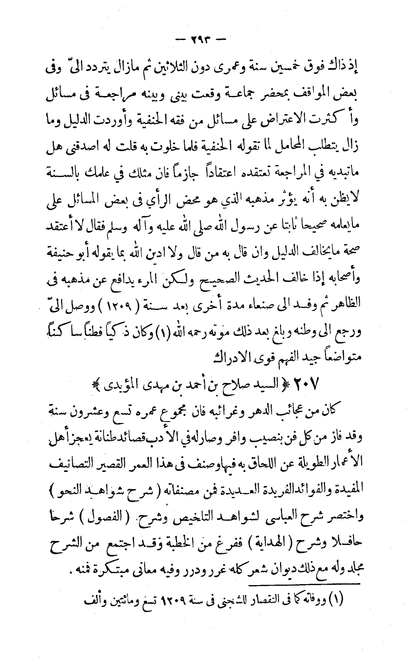 إِذْ ذَاك فَوق خمسين سنة وعمري دون الثَّلَاثِينَ ثمَّ مَا زَالَ يتَرَدَّد إليّ وفي بعض المواقف بِمحضر جمَاعَة وَقعت بيني وَبَينه مُرَاجعَة في مسَائِل وَأَكْثَرت الِاعْتِرَاض على مسَائِل من فقه الْحَنَفِيَّة وأوردت الدَّلِيل وَمَا زَالَ يتطلب المحامل لما تَقوله الْحَنَفِيَّة فَلَمَّا خلوت بِهِ قلت لَهُ أصدقني هَل ماتبدية فِي الْمُرَاجَعَة تعتقده اعتقاداً جَازِمًا فإن مثلك فِي علمك بِالسنةِ لَا يظن بِهِ أنه يُؤثر مذْهبه الَّذِي هُوَ مَحْض الرَّأْي في بعض الْمسَائِل على مَا يُعلمهُ صَحِيحا ثَابتا عَن رَسُول الله صلى الله عَلَيْهِ وَآله وَسلم فَقَالَ لَا أعتقد صِحَة مَا يُخَالف الدَّلِيل وإن قَالَ بِهِ من قَالَ وَلَا أدين الله بِمَا يَقُوله أَبُو حنيفَة وأصحابه إِذا خَالف الحَدِيث الصَّحِيح وَلَكِن الْمَرْء يدافع عَن مذْهبه في الظَّاهِر ثمَّ وَفد إلى صنعاء مُدَّة أُخْرَى بعد سنة 1209 وَوصل إليّ وَرجع إلى وَطنه وَبلغ بعد ذَلِك مَوته رَحمَه الله وَكَانَ ذكياً فطناً سَاكِنا متواضعاً جيد الْفَهم قوي الإدراك