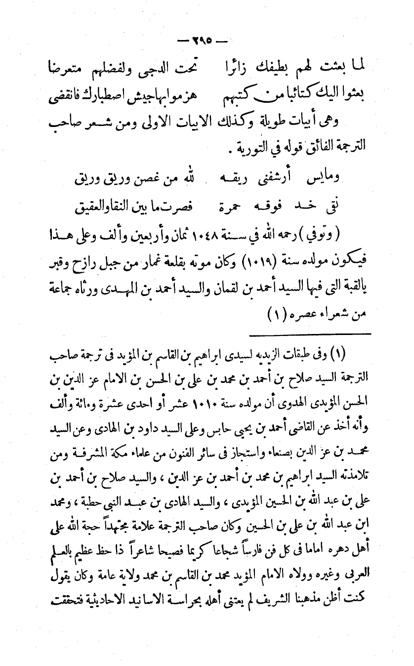 وَتوفى رَحمَه الله فِي سنة 1048 ثَمَان وَأَرْبَعين وَألف وعَلى هَذَا فَيكون مولده سنة 1019 وَكَانَ مَوته بقلعة غمار من جبل رازج وقبر بالقبة الَّتِى فِيهَا السَّيِّد أَحْمد بن لُقْمَان وَالسَّيِّد أَحْمد بن المهدي ورثاه جمَاعَة من شعراء عصره