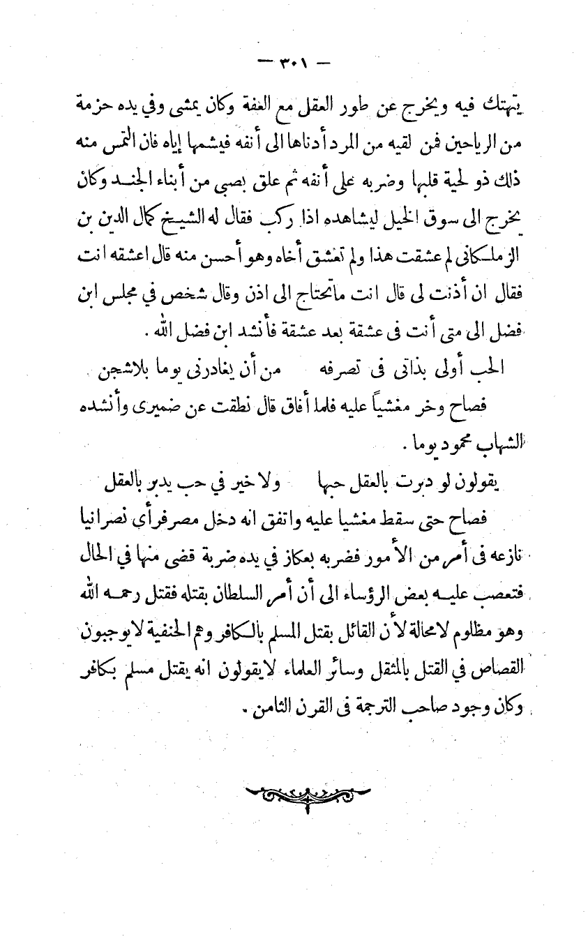 فصاح حَتَّى سقط مغشياً عَلَيْهِ وَاتفقَ أنه دخل مصر فَرَأى نَصْرَانِيّا نازعه في أَمر من الْأُمُور فَضَربهُ بعكاز فِي يَده ضَرْبَة قضى مِنْهَا فِي الْحَال فتعصب عَلَيْهِ بعض الرؤساء إلى أَن أَمر السُّلْطَان بقتْله فَقتل رَحمَه الله وَهُوَ مظلوم لَا محَالة لِأَن الْقَائِل بقتل الْمُسلم بالكافر وهم الْحَنَفِيَّة لَا يوجبون الْقصاص فِي الْقَتْل بالمثقل وَسَائِر الْعلمَاء لَا يَقُولُونَ إنه يقتل مُسلم بِكَافِر وَكَانَ وجود صَاحب التَّرْجَمَة في الْقرن الثَّامِن