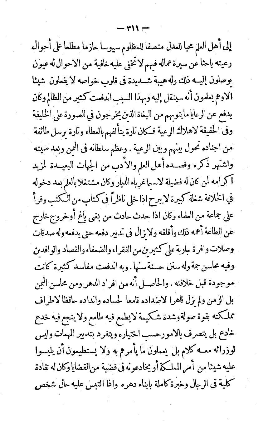 إِلَى أهل الْعلم محبا للعدل مصنفا للمظلوم سيوساً حازماً مطلعاً على أَحْوَال رَعيته باحثاً عَن سيرة عماله فيهم لَا تخفى عَلَيْهِ خافية من الأحوال لَهُ عُيُون يوصلون إِلَيْهِ ذَلِك وَله هَيْبَة شَدِيدَة فِي قُلُوب خواصه لَا يَفْعَلُونَ شَيْئا الاوهم يعلمُونَ أَنه سينقل إِلَيْهِ وَبِهَذَا السَّبَب اندفعت كثير من الْمَظَالِم وَكَانَ يدْفع عَن الرعايا مَا ينوبهم من الْبُغَاة الَّذين يخرجُون فِي الصُّورَة على الْخَلِيفَة وَفِي الْحَقِيقَة لإهلاك الرعية فَكَانَ تَارَة يتألّفهم بالعطاء وَتارَة يُرْسل طَائِفَة من أجناده تحول بَينهم وَبَين الرعية وَعظم سُلْطَانه فِي الْيمن وَبعد صيته واشتهر ذكره وقصده أهل الْعلم وَالْأَدب من الْجِهَات الْبَعِيدَة لمزيد اكرامه لمن كَانَ لَهُ فَضِيلَة لَا سِيمَا غرباء الديار وَكَانَ مشتغلاً بِالْعلمِ بعد دُخُوله فِي الْخلَافَة شفلة كَبِيرَة لَا يبرح إذا خلى نَاظرا فِي كتاب من الْكتب وَقَرَأَ على جمَاعَة من الْعلمَاء وَكَانَ إذا حدث حَادث من بغي بَاغ أَو خُرُوج خَارج عَن طَاعَة أهمه ذَلِك وأقلقه وَلَا يزَال فِي تَدْبِير دَفعه حَتَّى يَدْفَعهُ وَله صدقَات وصلات وافرة جَارِيَة على كثيرين من الْفُقَرَاء والضعفاء والقصاد والوافدين وَفِيه محَاسِن جمة وَله سنَن حَسَنَة سنّهَا وَبِه اندفعت مفاسد كَثِيرَة كَانَت مَوْجُودَة قبل خِلَافَته وَالْحَاصِل أَنه من أفراد الدَّهْر وَمن محَاسِن الْيمن بل الزَّمن وَلم يزل قاهراً لأضداده قامعاً لحساده وأنداده حَافِظًا لأطراف مَمْلَكَته بِقُوَّة صولة وَشدَّة شكيمة لَا يطْمع فِيهِ طامع وَلَا ينجع فِيهِ خدع خَادع بل يتَصَرَّف بالأمور حسب اخْتِيَاره ويتفرد بتدبير الْمُهِمَّات وَلَيْسَ لوزرائه مَعَه كَلَام بل يعْملُونَ مَا يَأْمُرهُم بِهِ وَلَا يَسْتَطِيعُونَ أَن يلبسوا عَلَيْهِ شَيْئا من أَمر المملكة أَو يخادعونه فِي قَضِيَّة من القضايا وَكَانَ لَهُ نقادة كُلية فِي الرِّجَال وخبرة كَامِلَة بأبناء دهره وإذا الْتبس عَلَيْهِ حَال شخص