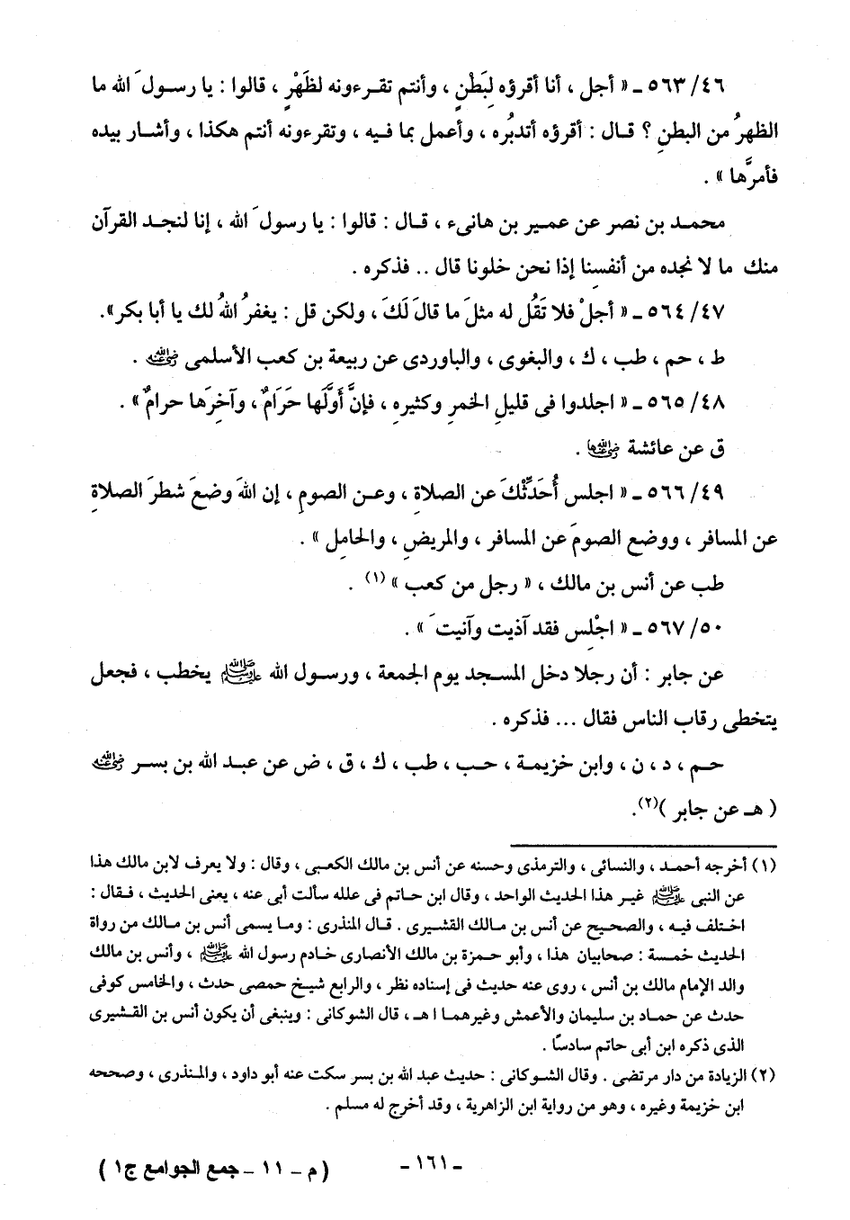 (¬1) أخرجه أحمد، والنسائى، والترمذى وحسنه عن أنس بن مالك الكعبى، وقال: ولا يعرف لابن مالك هذا عن النبى - صلى الله عليه وسلم - غير هذا الحديث الواحد، وقال ابن حاتم في علله سألت أبى عنه، يعنى الحديث، فقال: اختلف فيه، والصحيح عن أنس بن مالك القشيرى. قال المنذرى: وما يسمى أنس بن مالك من رواة الحديث خمسة: صحابيان هذا، وأبو حمزة بن مالك الأنصارى خادم رسول الله - صلى الله عليه وسلم -، وأنس بن مالك والد الإمام مالك بن أنس، روى عنه حديث في إسناده نظر، والرابع شيخ حمصى حدث، والخامس كوفى حدث عن حماد بن سليمان والأعمش وغيرهما اهـ، قال الشوكانى: وبنبغى أن يكون أنس بن القشيرى الذى ذكره ابن أبى حاتم سادسًا.