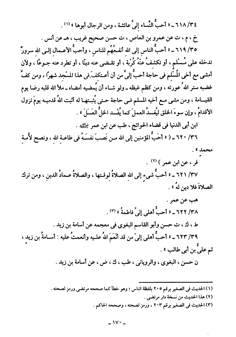 39/ 623 - "أحبُّ أهلى إلىّ من قد أنْعَمَ اللهُ عليه وأنعمتُ عليه: أسامةُ بن زيدٍ، ثم علىُّ بن أبى طالب".