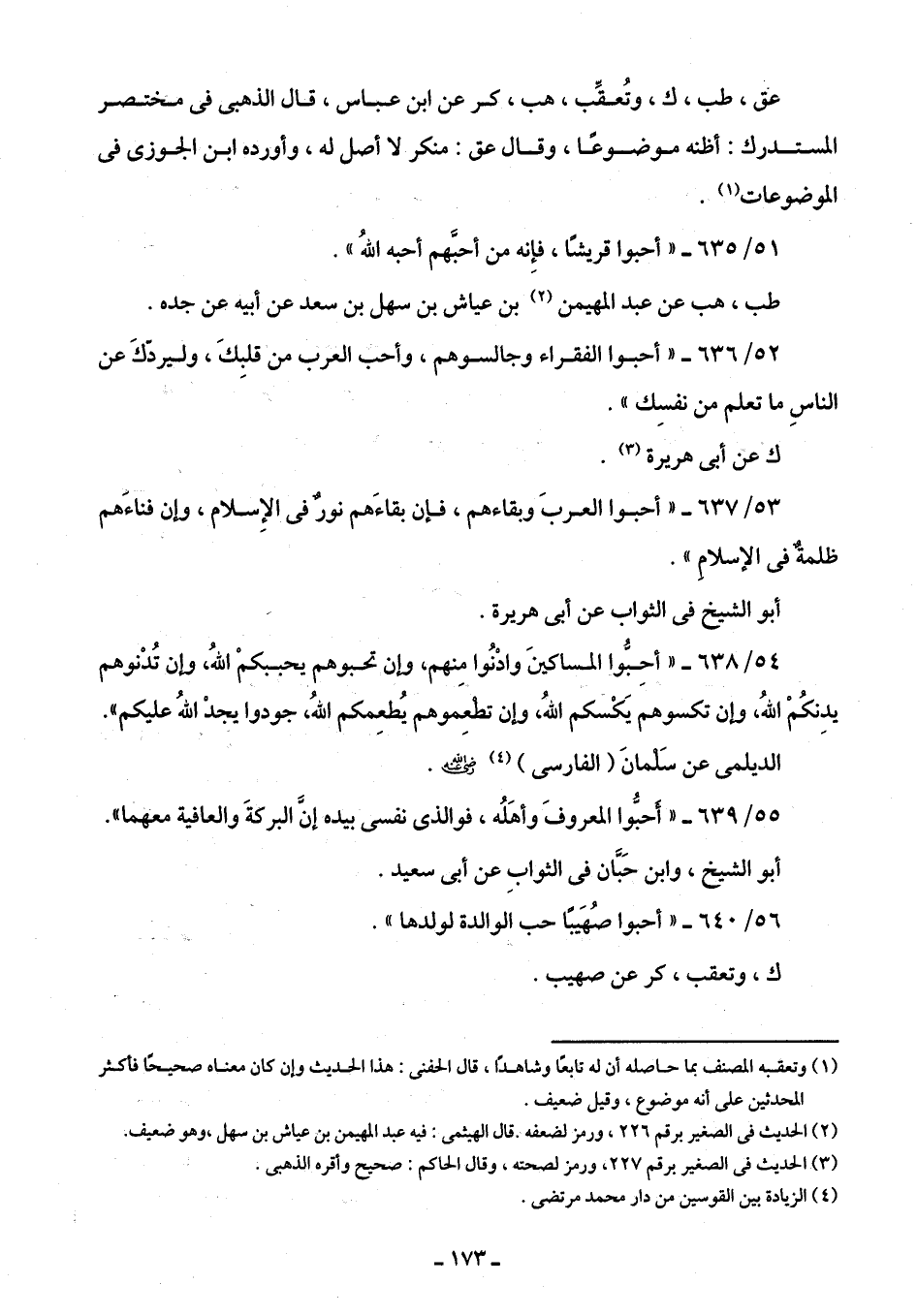 53/ 637 - "أحبوا العربَ وبقاءهم، فإن بقاءَهم نورٌ في الإِسلام، وإن فناءَهم ظلمةٌ في الإسلامِ".