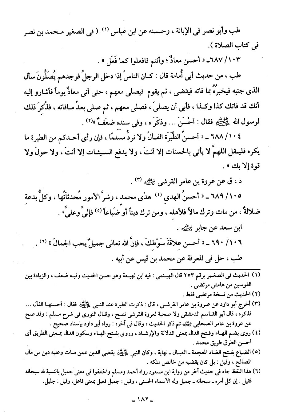 106/ 690 - "أحسن عِلاقَةَ سَوْطِكَ، فإنَّ الله تعالى جميلٌ يحب الجمالَ" (¬6).