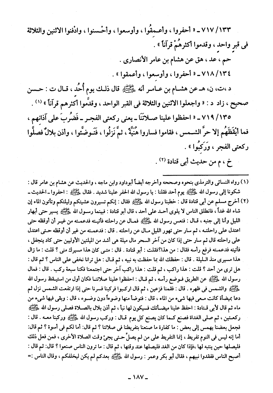 133/ 717 - "أحفروا، وأعمِقُوا، وأوسعوا، وأحْسنوا، وادْفنوا الاثنين والثلاثة في قبرٍ واحدٍ، وقدموا أكثرهُمْ قرآنًا".