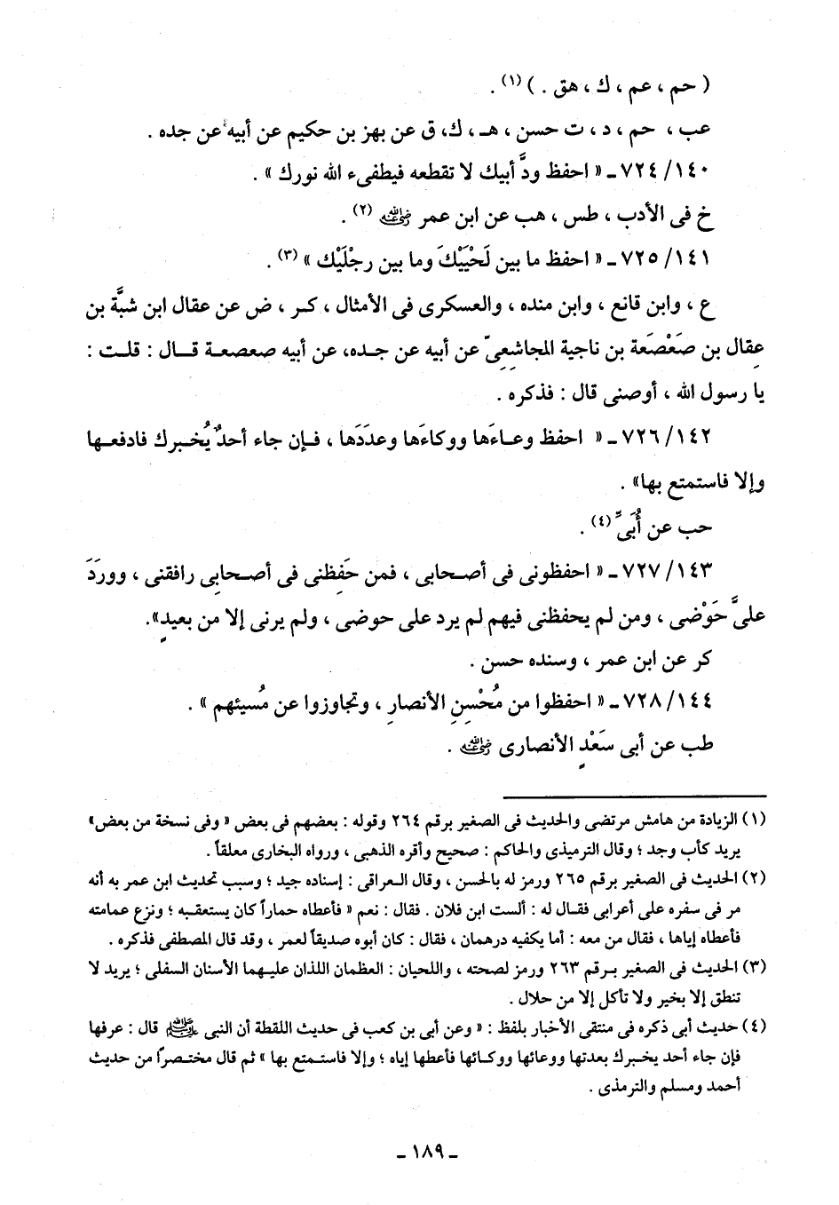 143/ 727 - "احفظونى في أصحابى، فمن حَفِظنى في أصحابِى رافقنى، وورَدَ علىَّ حَوْضى، ومن لم يحفظنى فيهم لم يرد على حوضى، ولم يرنى إلا من بعيدٍ".