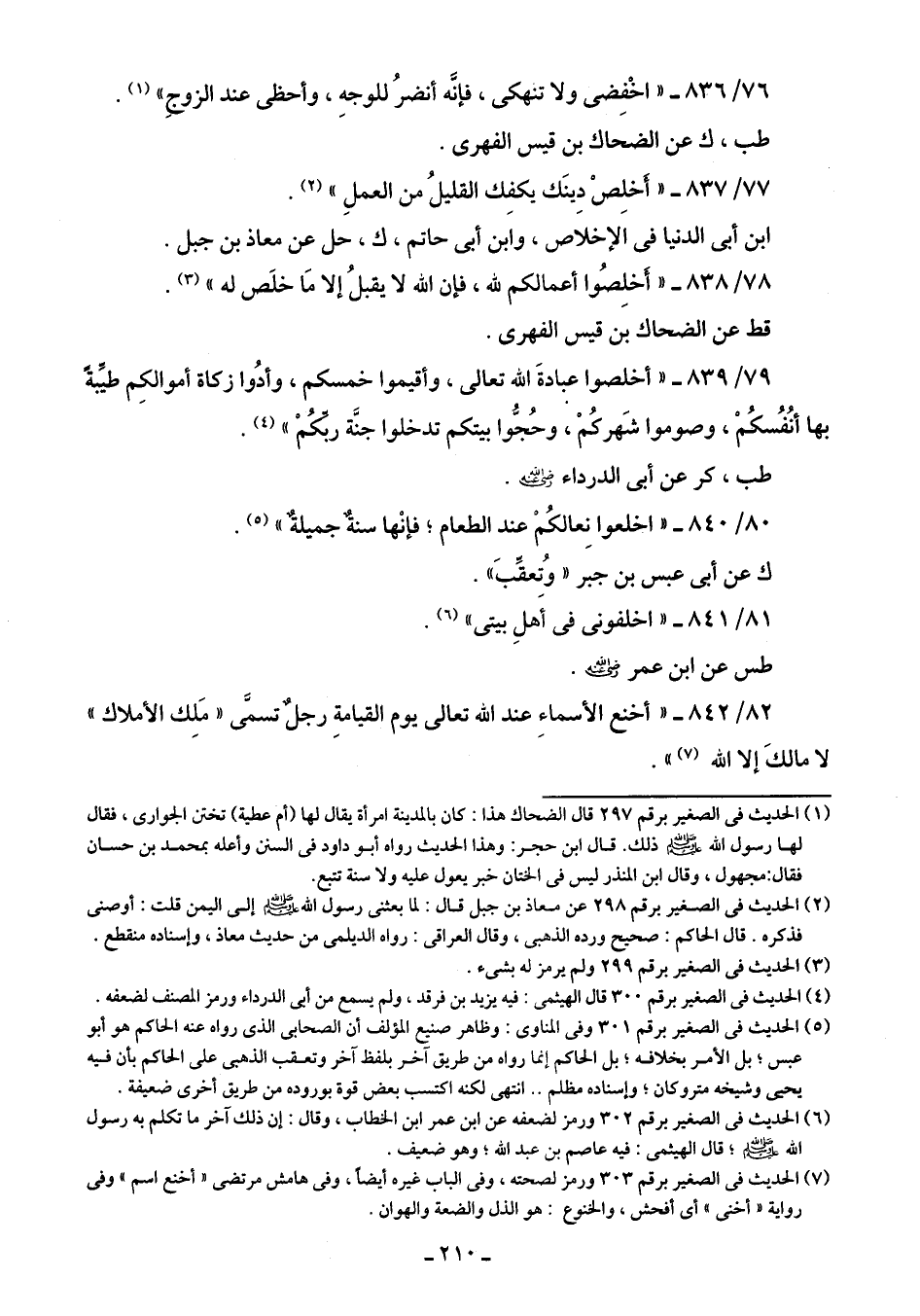 (¬6) الحديث في الصغير برقم 302 ورمز لضعفه عن ابن عمر ابن الخطاب، وقال: إن ذلك آخر ما تكلم به رسول الله - صلى الله عليه وسلم -، قال الهيثمى: فيه عاصم بن عبد الله؛ وهو ضعيف.