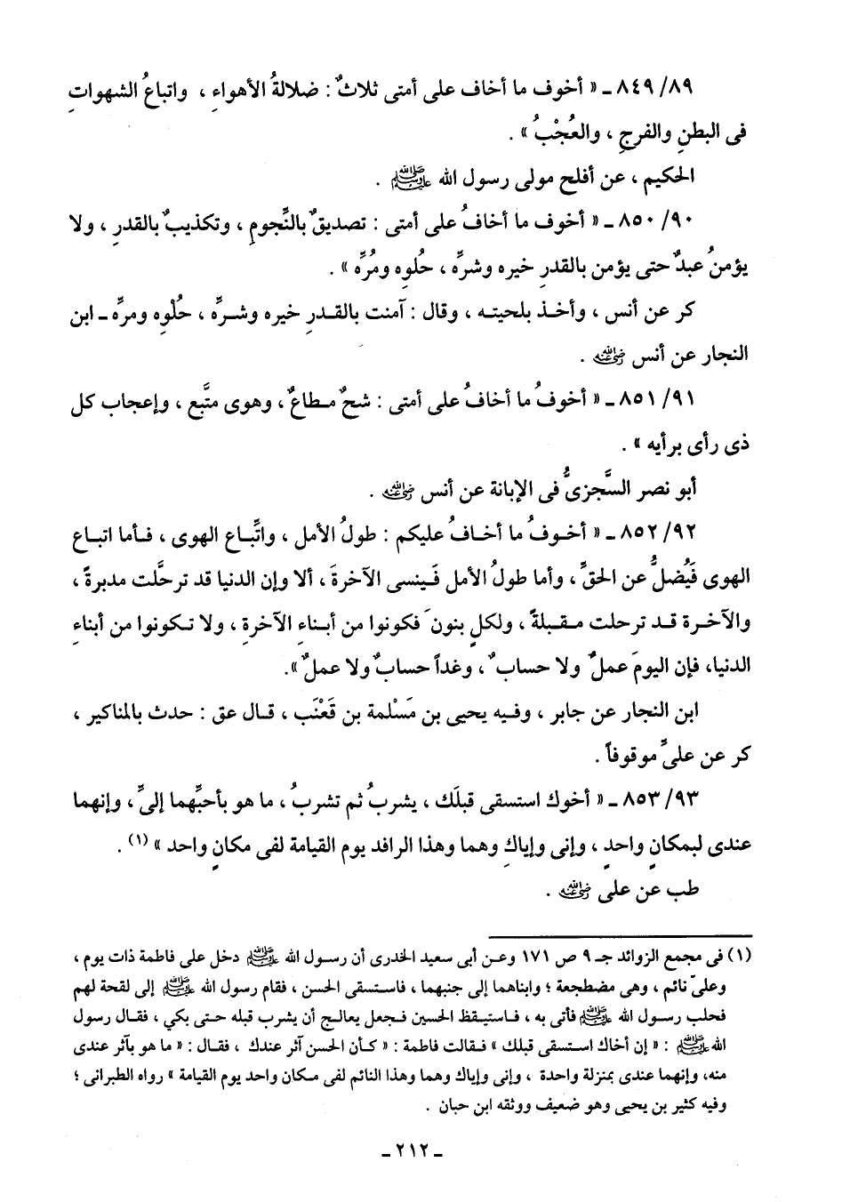 89/ 849 - "أخوف ما أخاف على أمتى ثلاثٌ: ضلالةُ الأهواءِ، واتباعُ الشهواتِ في البطنِ والفرجِ، والعُجْبُ".