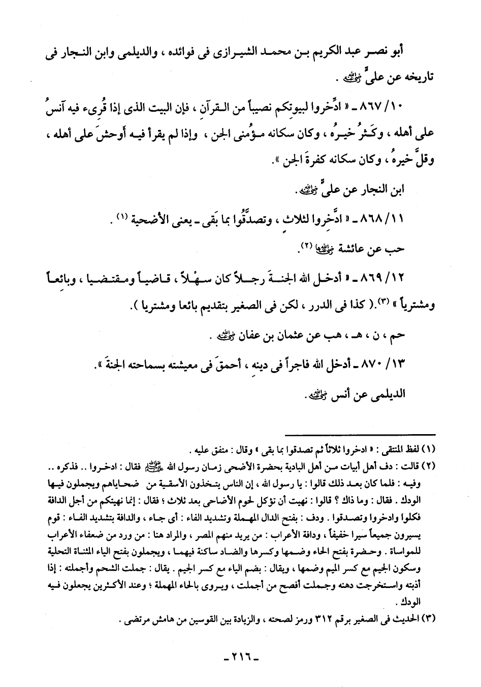 10/ 867 - "ادَّخروا لبيوتِكم نصيبًا من القرآنِ، فإن البيت الذى إذا قُرِئ فيه آنسُ على أهله، وكَثرُ خيرُه، وكان سكانه مؤُمنى الجن، وإذا لم يقرأ فيه أَوحشَ على أهله، وقلَّ خيرهُ، وكان سكانه كفرةَ الجن".