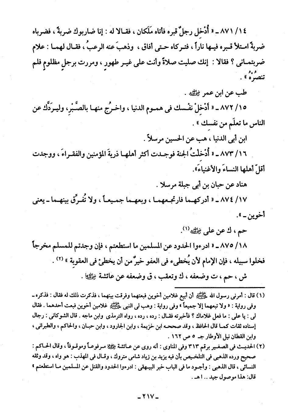 18/ 875 - "ادرءوا الحدود عن المسلمين ما استطعتم، فإن وجدتم للمسلم مخرجًا فخلوا سبيله، فإن الإمام لأن يُخطئ في العفو خيرٌ من أن يخطئ في العقوبِة" (¬2).
