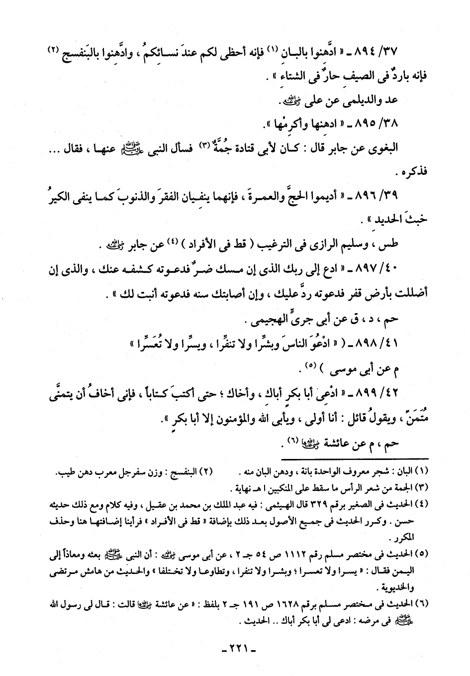 37/ 894 - "ادَّهِنوا بالبانِ (¬1) فإنه أحظى لكم عندَ نسائِكمُ، وادَّهنوا بالبَنفسج (¬2) فإنه باردٌ في الصيفِ حارٌ في الشتاءِ".