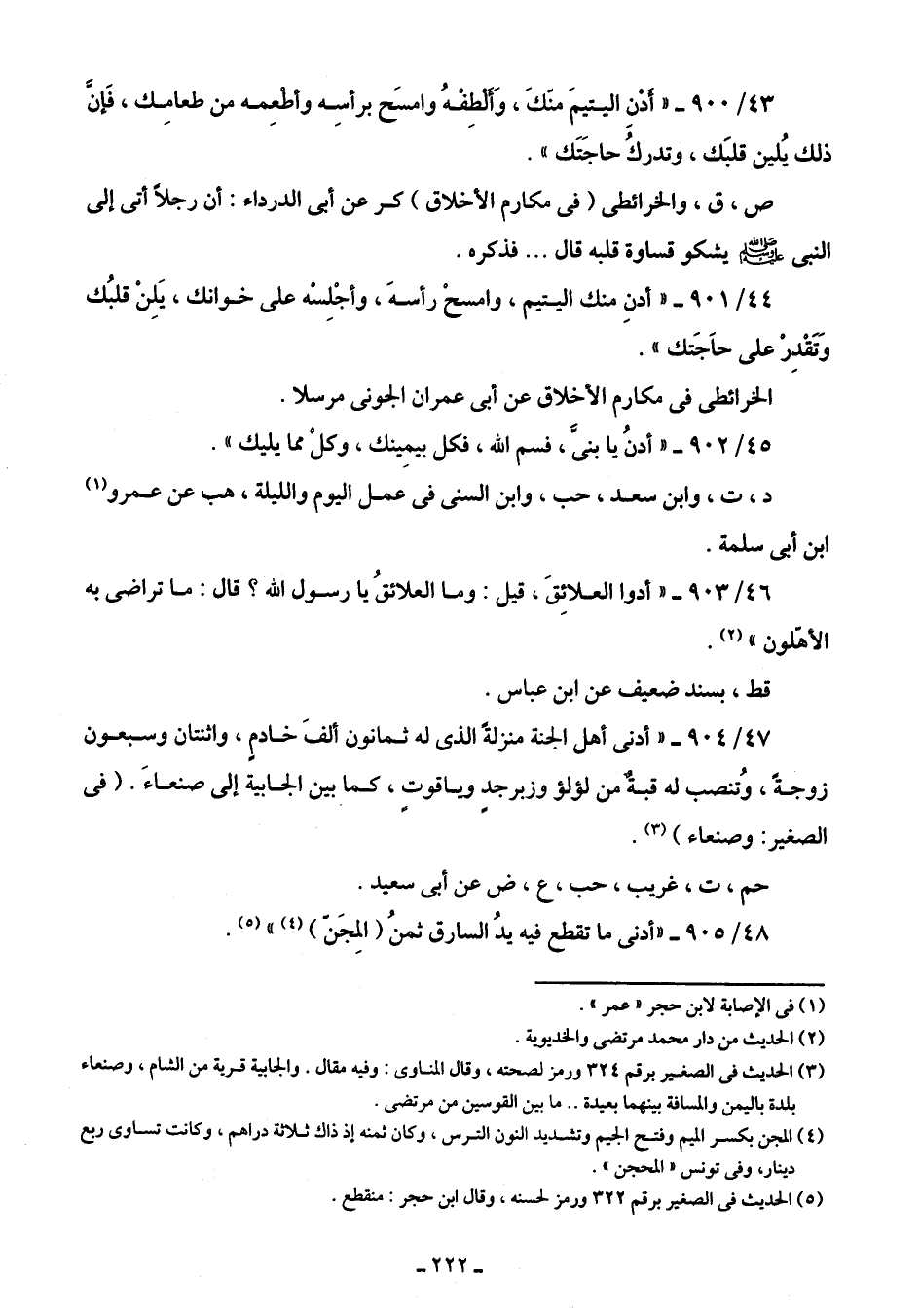 47/ 904 - "أدنى أهل الجنة منزلةً الذى له ثمانون ألفَ خادمٍ، واثنتان وسبعون زوجةً، وتُنصب له قبةٌ من لؤلؤ وزبرجدٍ وياقوتٍ، كما بين الجابية إلى صنعاءَ. (في الصغير: وصنعاء) (¬3).