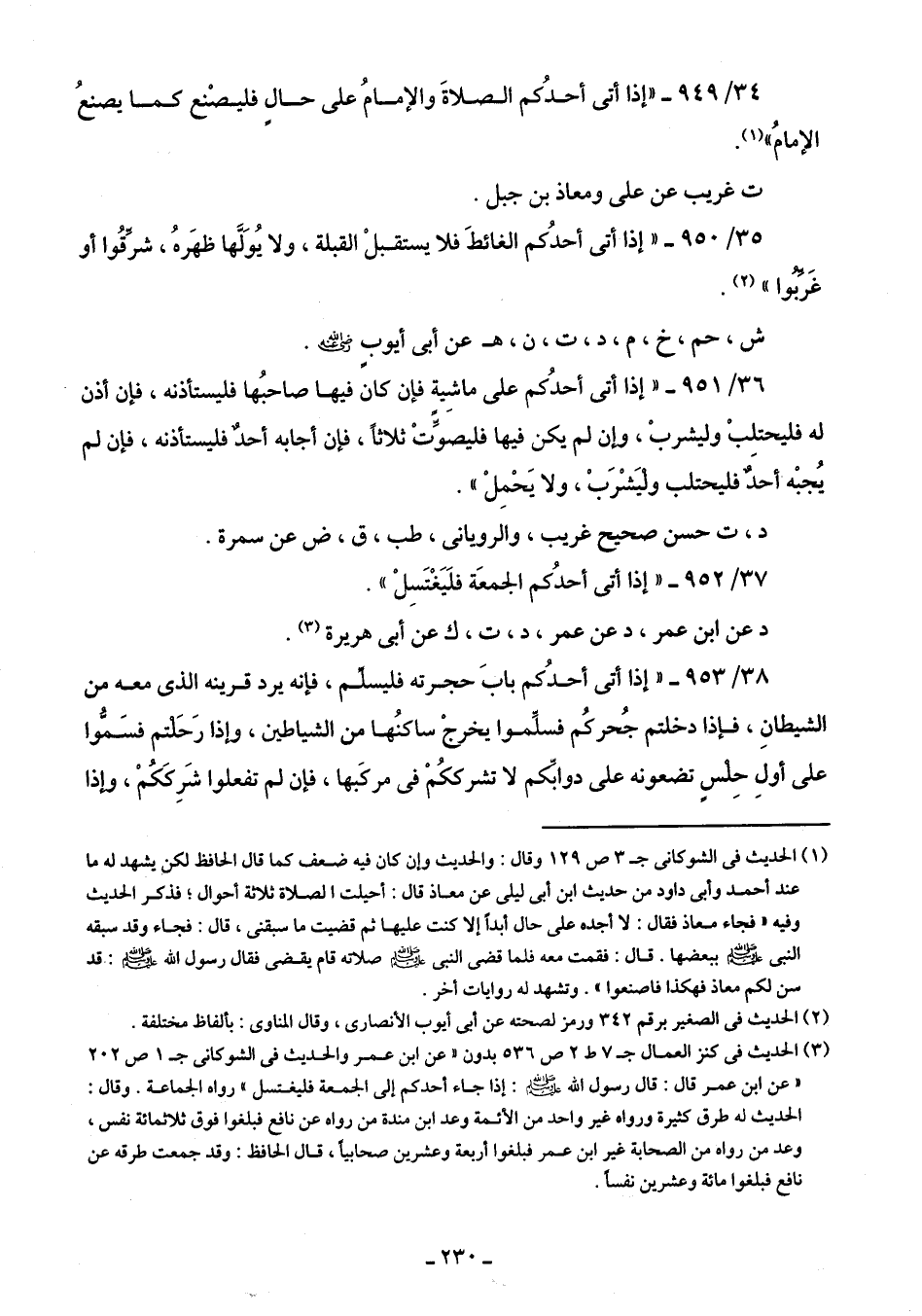 38/ 953 - "إذا أتى أحدُكم بابَ حجرته فليسلَّم، فإنه يرد قرينه الذى معه من الشيطانِ، فإذا دخلتم جُحركُم فسلِّموا يخرجْ ساكنُها من الشياطين، وإذا رَحَلْتم فسَمُّوا على أولِ حِلْسٍ تضعونه على دوابَّكم لا تشرككُمْ في مركبها، فإن لم تفعلوا شَرِككُمْ، وإذا