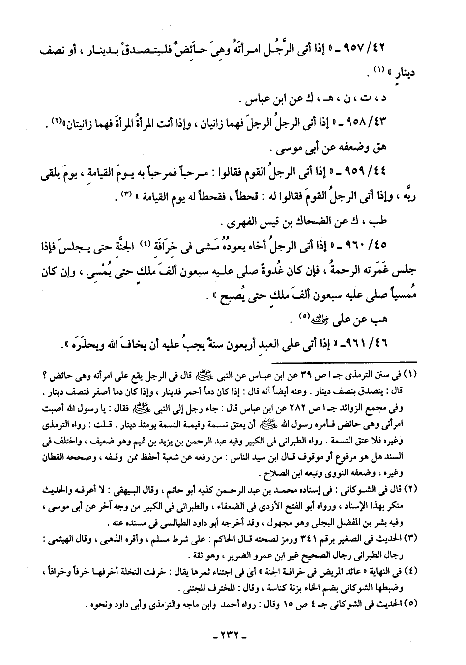 42/ 957 - "إذا أتى الرَّجلُ امرأتَهُ وهِىَ حَائِضٌ فليتصدقْ بدينار، أو نصف دينارٍ" (¬1).