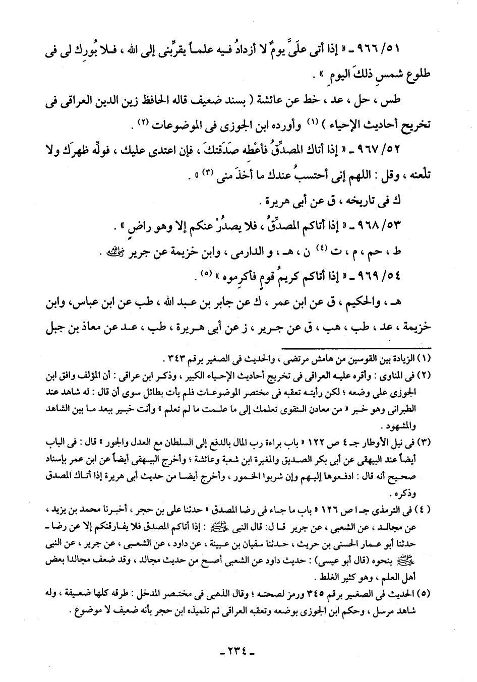 (¬5) الحديث في الصغير برقم 345 ورمز لصحته؛ وقال الذهبى في مختصر المدخل: طرقه كلها ضعيفة، وله شاهد مرسل، وحكم ابن الجوزى بوضعه وتعقبه العراقى ثم تلميذه ابن حجر بأنه ضعيف لا موضوع.