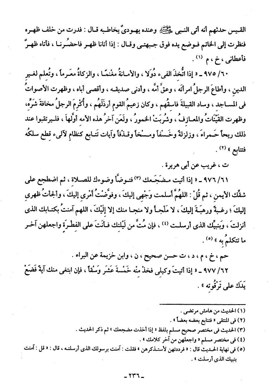 61/ 976 - "إذا أتيت مضَجَعك (¬3) فتوضَّأ وضوءك للصلاةِ، ثم اضطجع على شقِّك الأيمنِ، ثم قُلْ: اللهُمَّ أسلمت وَجْهِى إليكَ، وفوَّضْتُ أمْري إليكَ، وألجأتُ ظهرىِ إليكَ؛ رغبةً ورهبَةَ إليكَ، لا مَلْجأَ ولا منجا منك إلا إِلَيْكَ، اللهم آمنتُ بكتابك الذى أنزلتَ، وَبنبيَّك الذى أرسلت (¬4)، فإن مُتَّ من لَيْلتِك فأنَتَ على الفِطْرَةِ واجعلهن آخر ما تتكلمُ بِه" (¬5).
