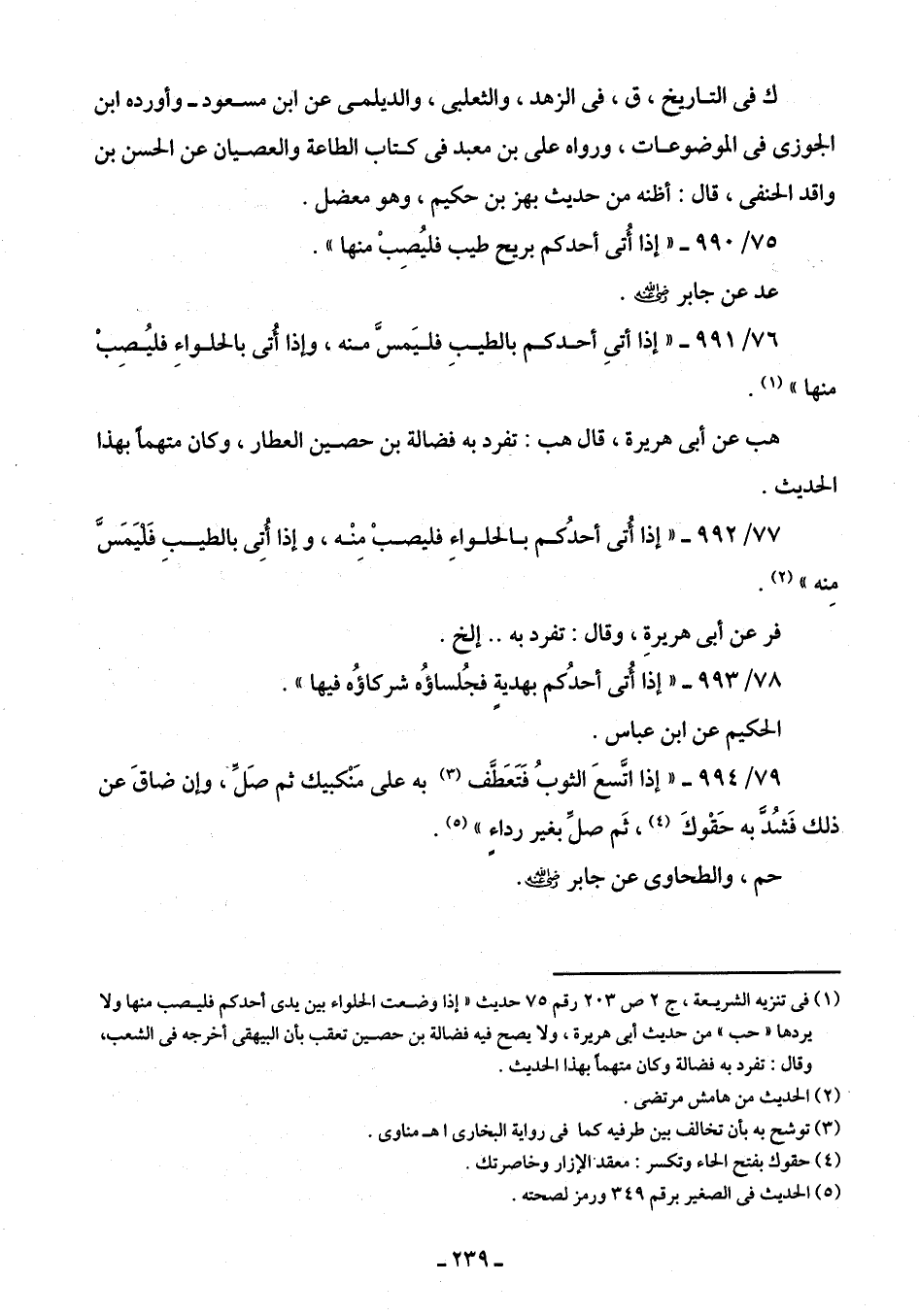 (¬1) في تنزيه الشريعة، ج 2 ص 203 رقم 75 حديث "إذا وضعت الحلواء بين يدى أحدكم فليصب منها ولا يردها "حب" من حديث أبى هريرة، ولا يصح فيه فضالة بن حصين تعقب بأن البيهقى أخرجه في الشعب، وقال: تفرد به فضالة وكان متهمًا بهذا الحديث.