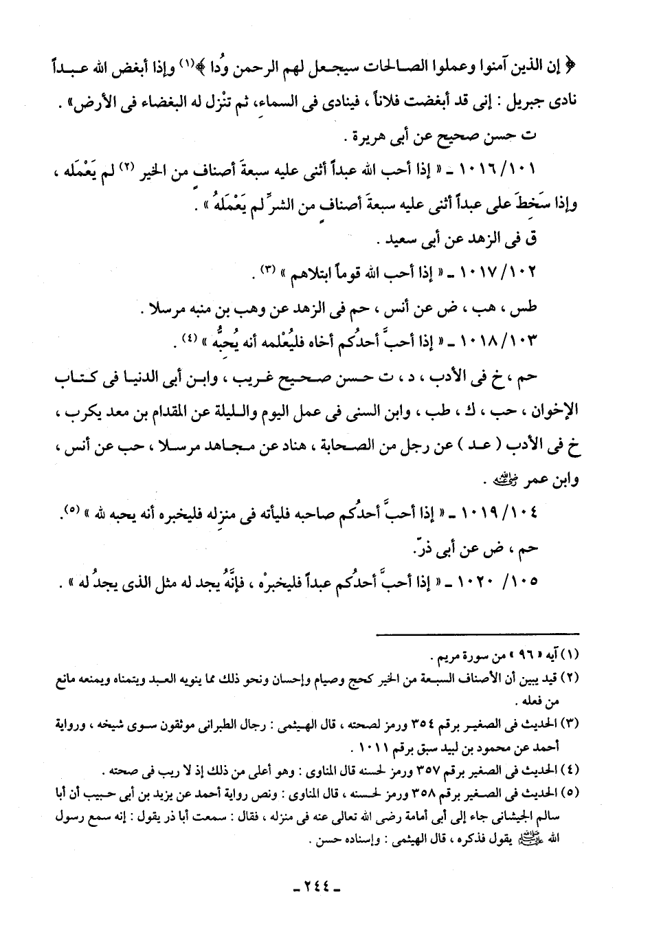 104/ 1019 - "إذا أحبَّ أحدُكم صاحبه فليأته في منزِله فليخبره أنه يحبه لله" (¬5).