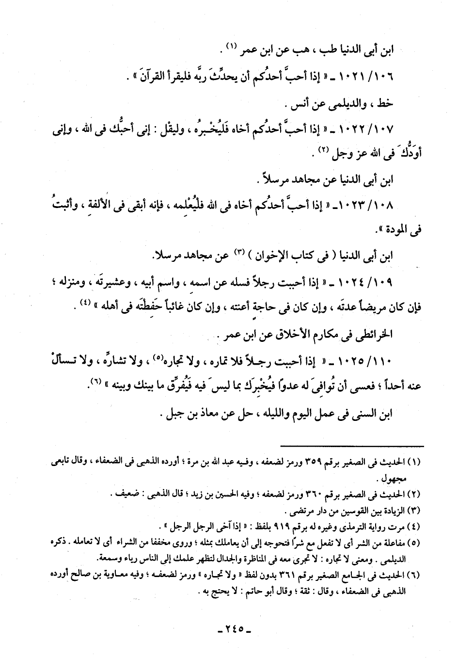 107/ 1022 - "إذا أحبَّ أحدُكم أخاه فَليُخْبرُه، وليقْل: إنى أحبُّك في الله، وإنى أوَدُّكَ في الله عز وجل (¬2).