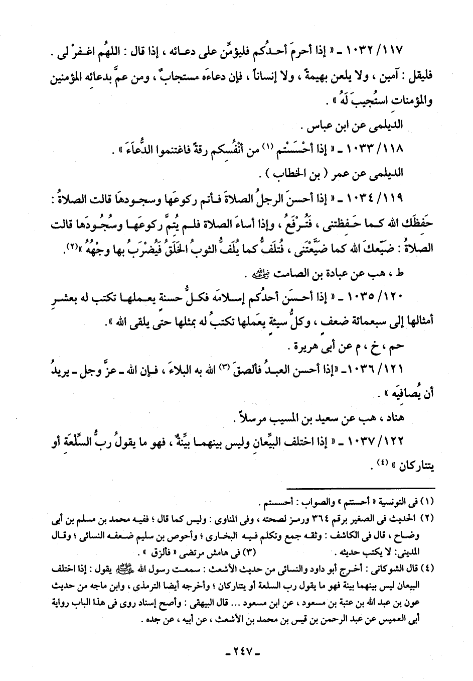 120/ 1035 - "إذا أحسَن أحدُكم إسلامَه فكلُّ حسنةٍ يعملها تكتب له بعشرِ أمثالها إلى سبعمائة ضعفٍ، وكلُّ سيئةٍ يعملها تكتبُ له بمثلها حتى يلقى الله".