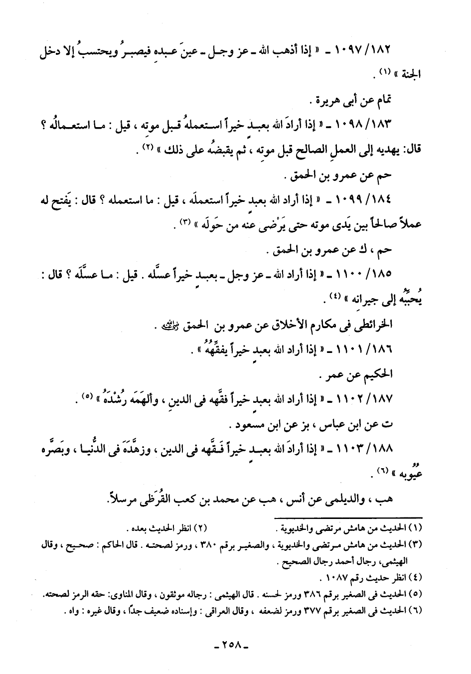 188/ 1103 - "إذا أرادَ الله بعبدٍ خيرًا فَقَهه في الدين، وزهَّدَهَ في الدُّنيا، وبَصَّره عُيُوبه" (¬6).