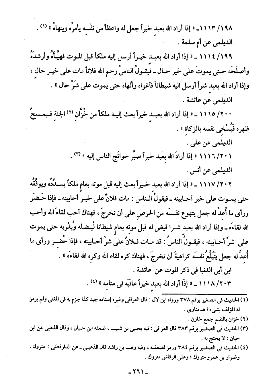 202/ 1117 - "إذا أراد الله بعبد خيرًا بعث إليه قبل موته بعامٍ ملكًا يسدِّدُه ويوفِّقُه حتى يموت على خير أحايينه - فيقولُ الناس: مات فلانٌ على خير أحايينه - فإذا حَضَر ورأى ما أُعِدَّله جعل يتهوع نفسَه من الحرصِ على أن تخرجَ، فهناك أحب لقاءَ الله وأحب الله لقاءَه - وإذا أراد الله بعبد شرا قيض له قبل موتِه بعامٍ شيطانا ليُضله ويغْويه حتى يموت على شرِّ أحايينه، فيقولُ الناسُ: قد مات فلانٌ على شرِّ أحايينه، فإذا حُضِر ورأى ما أُعِدَّ له جعل يتَبَلَّعُ نفسَه كراهيةَ أن تخرجَ، فهناك كره لقاء الله وكرِه الله لقاءَه".