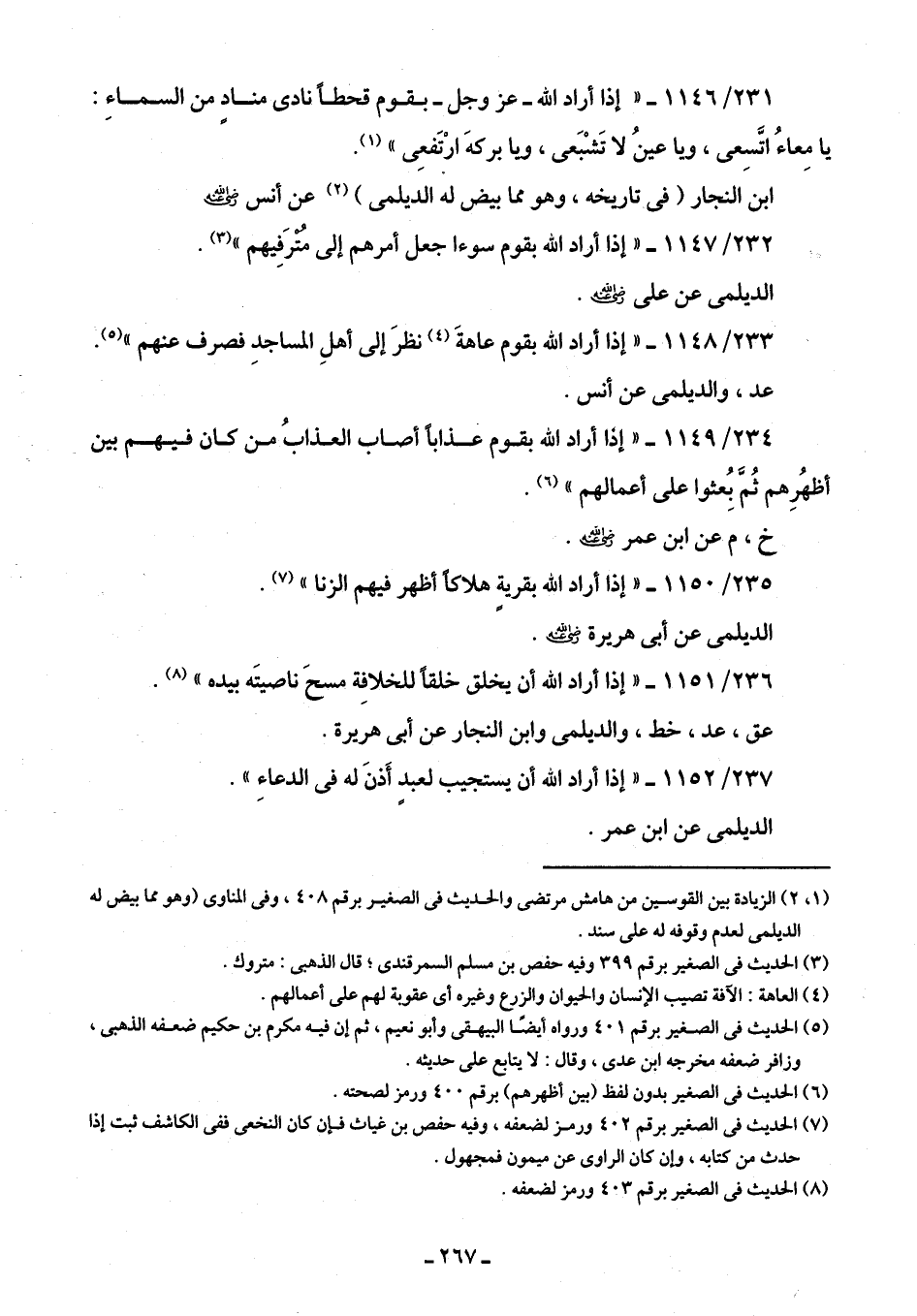 231/ 1146 - "إذا أراد الله - عزَّ وجلَّ - بقوم قحطًا نادى منادٍ من السماءِ: يا مِعاءُ اتَّسِعى، ويا عينُ لا تَشْبَعى، ويا بركهَ ارْتَفعِى" (¬1).