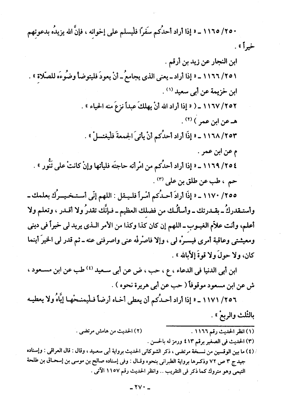 250/ 1165 - "إذا أراد أحدُكم سَفرًا فلْيسلم على إخوانِه، فإنَّ الله يزيدُه بدعوتِهم خيرًا".