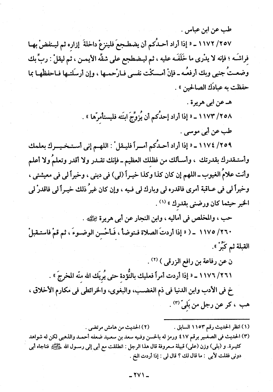 259/ 1174 - " إذا أراد أحدُكم أمرًا فليقلْ: اللهم إني أستخيرك بعلمك وأستقدرك بقدرتك، وأسألك من فظلِك العظيم- فإنك تقدر ولا أقدر وتعلمُ ولا أعلم وأنت علامُ الغيوب- اللهم إن كان كذا وكذا خيرًا (لي) في دينى، وخيرًا لي في معيشتى، وخيرًا لي في عاقبة أمرى فاقدره لي وبارك لي فيه، وإن كان غيرُ ذلك خيرًا لي فاقدرْ لي الخير حيثما كان ورضنى بقدرِك" (¬1).