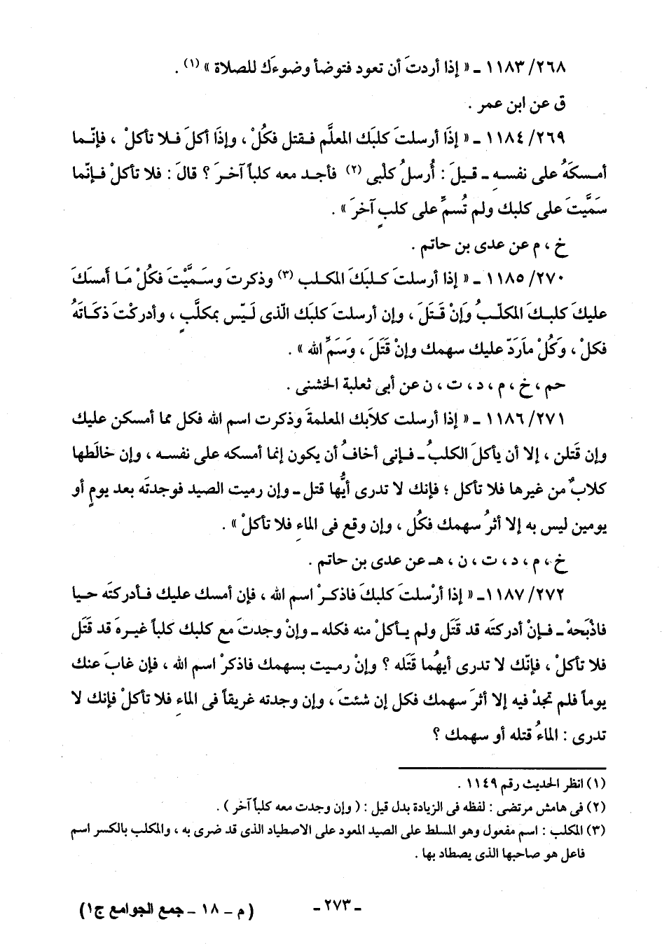 272/ 1187 - " إذا أرْسلتَ كلبكَ فاذكرْ اسم الله، فإن أمسك عليك فأدركتَه حيا فاذبَحهْ -فإنْ أدركتَه قد قَتَل ولم يأكلْ منه فكله- وإنْ وجدتَ مع كلبك كلبًا غيرهَ قد قَتَل فلا تأكلْ، فإنّك لا تدرى أيهُما قَتَله؟ وإنْ رميت بسهمك فاذكرْ اسم الله، فإن غابَ عنك يومًا فلم تجدْ فيه إلا أثرَ سهمك فكل إن شئتَ، وإن وجدته غريقًا في الماءِ فلا تأكلْ فإنك لا تدرى: الماءُ قتله أو سهمك؟