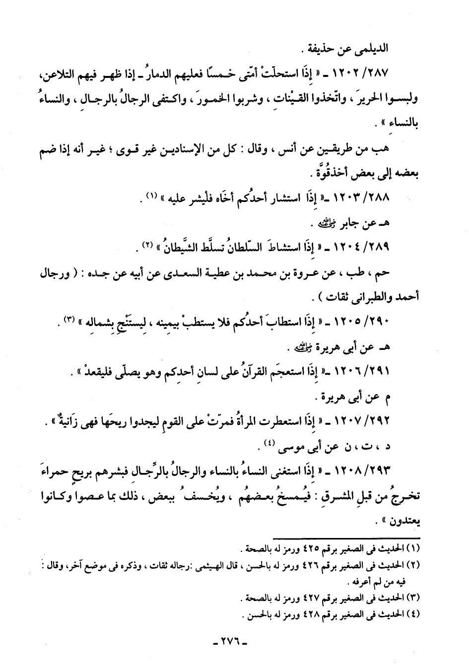 287/ 1202 - " إِذَا استحلّتْ أمّتى خمسًا فعليهم الدمارُ- إذا ظهر فيهم التلاعن، ولبسوا الحريرَ، واتخذوا القيناتِ، وشربوا الخمورَ، واكتفى الرجالُ بالرجالِ، والنساءُ بالنساءِ".