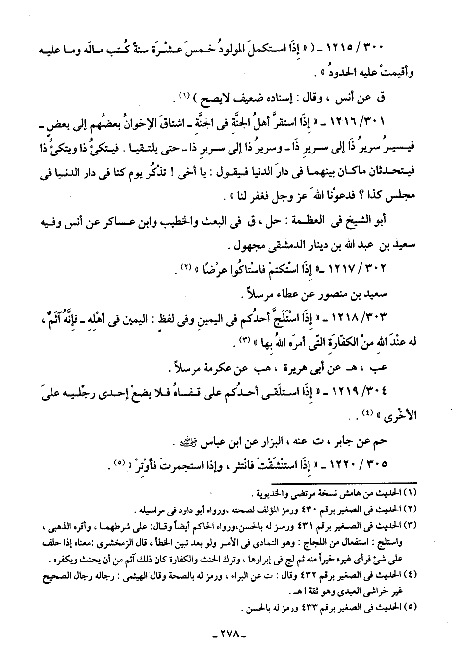 300/ 1215 - ("إِذَا استكملَ المولودُ خمسَ عشْرَة سنة كُتب ماله وما عليه وأقيمتْ عليه الحدودُ".