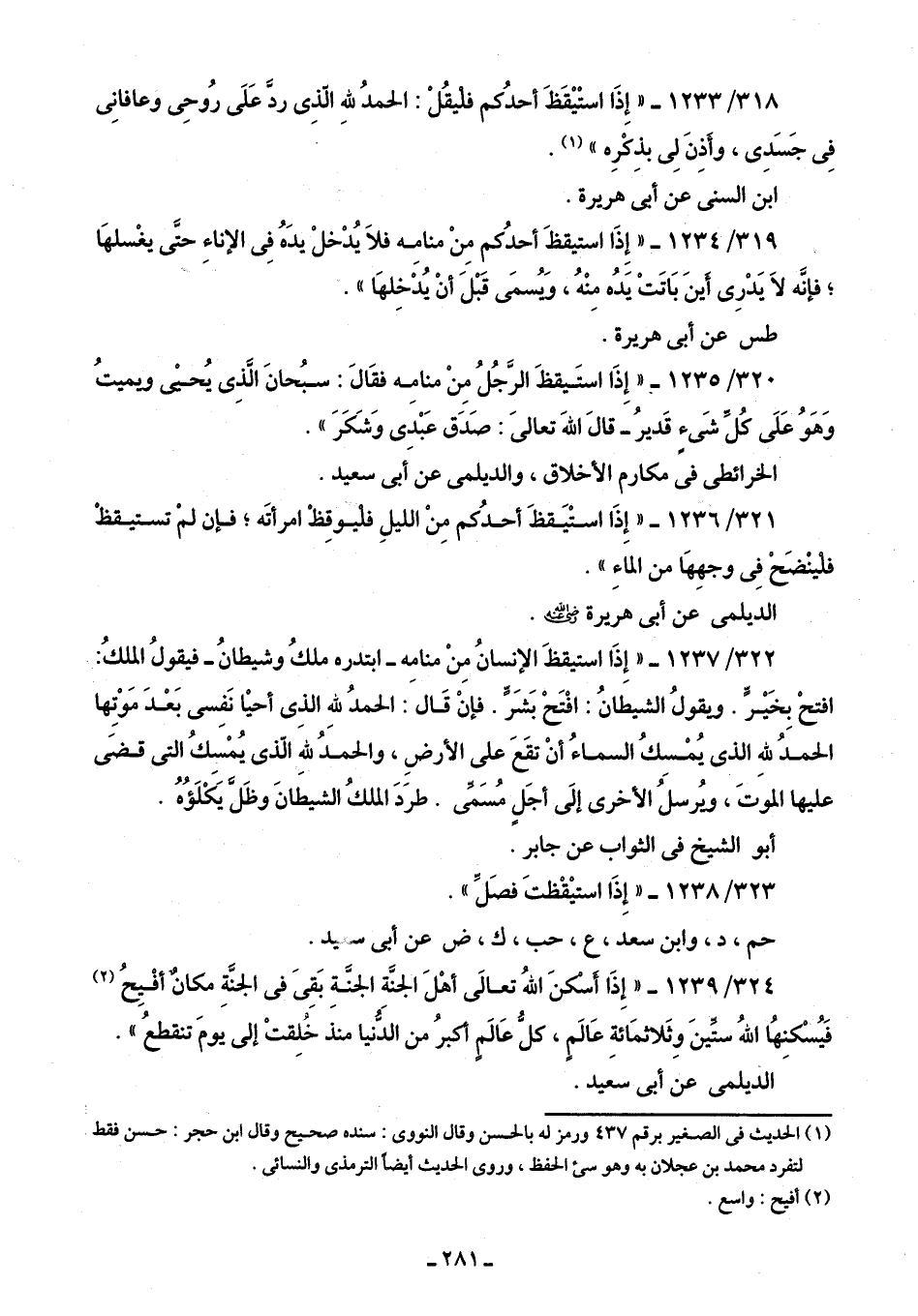 322/ 1237 - "إِذَا استيقظَ الإنسانُ مِنْ منامه- ابتدره ملكُ وشيطانُ- فيقولُ الملكُ: - افتحْ بخَير. ويقولُ الشيطانُ: افْتَحْ بَشَرٍّ. فإنْ قَال: الحمدُ لله الذِى أحيا نَفِسى بَعْدَ مَوْتِها الحمدُ لله الذي يُمْسِكُ السماءُ أنْ تقَعَ على الأرضِ، والحمَدُ لله الذي يُمْسكُ التي قضَى عليها الموَتَ، ويُرسلُ الأخرى إلَى أجَلٍ مُسَمّى. طرَدَ الملكُ الشيطَانَ وظَل يَكلَؤُهُ.