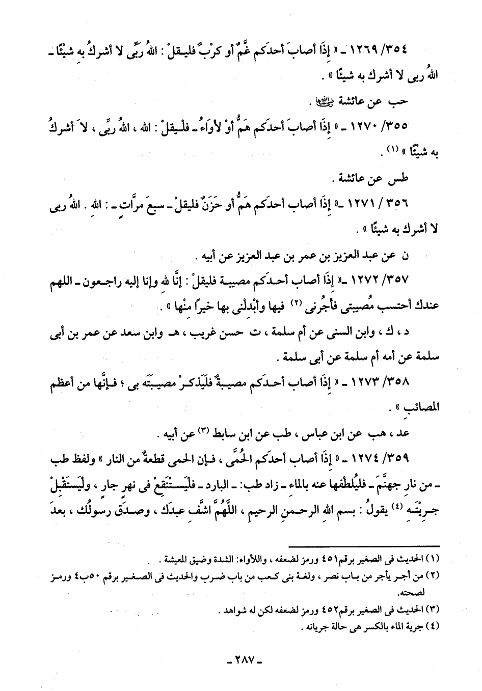 357/ 1272 - "إِذَا أصاب أحدَكم مصيبة فليقلْ: إنَّا للهِ وإنا إليه راجعون- اللهم عندك أحتسب مُصيبتى فأجُرنى (¬2) فيها وأبْدِلنى بها خيرًا مِنْها".