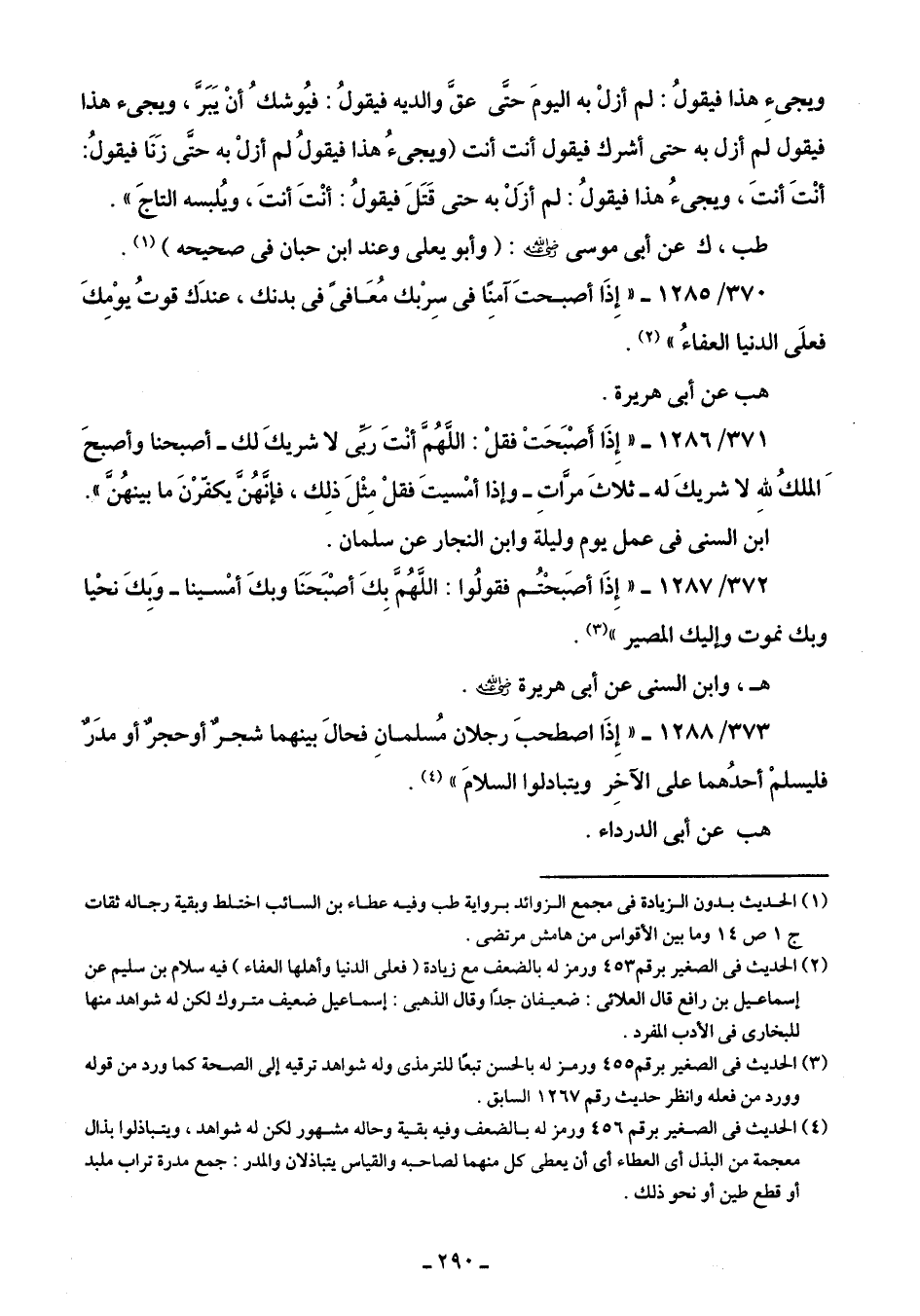 371/ 1286 - "إِذَا أصْبَحتَ فقلْ: اللَّهُمَّ أنْتَ ربى لا شريكَ لك -أصبحنا وأصبحَ الملكُ للهِ لا شريكَ له- ثلاثَ مراتِ- وإذا أمْسيتَ فقلْ مِثْلَ ذلِك، فإنهنَّ يكفِّرْنَ ما بينهُن".