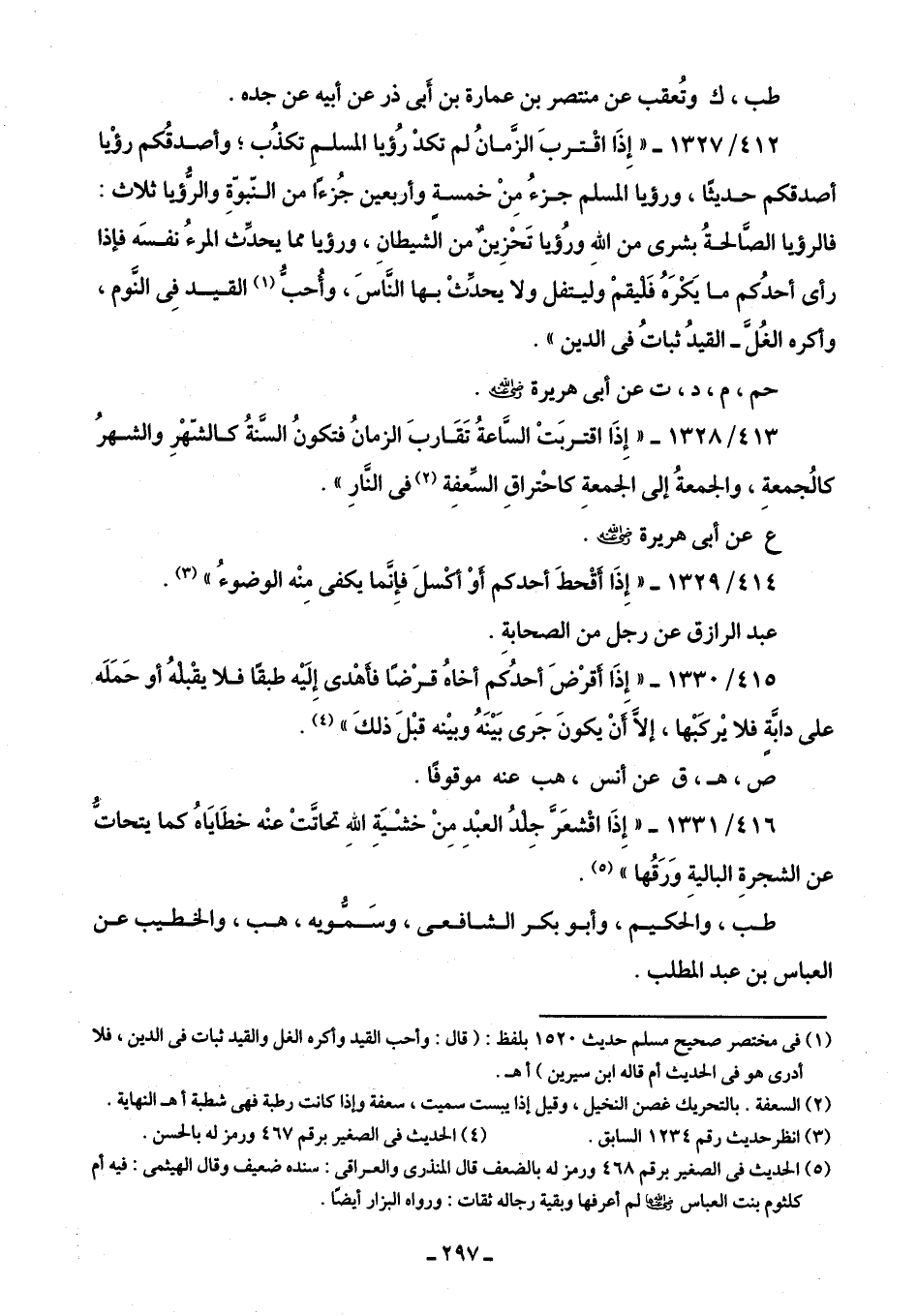 412/ 1327 - "إِذَا اقْتربَ الزَّمانُ لم تكدْ رُؤيا المسلم تكذُب؛ وأصدقُكم رؤيا أصدقكم حديثًا، ورؤيا المسلم جزءُ مِنْ خمسة وأربعين جُزءًا من النّبوةِ والرؤيا ثلاث: فالرؤيا الصَّالحةُ بشرى من اللهِ ورُؤيا تَحْزِينٌ من الشيطانِ، ورؤيا مما يحدِّث المرءُ نفسَه فإذا رأى أحدُكم ما يَكْرَهُ فَليقمْ وليتفل ولا يحدِّثْ بها الناسَ، وأُحبُّ (¬1) القيد فِي النَّوم، وأكره الغُلَّ- القيدُ ثباتُ في الدين".