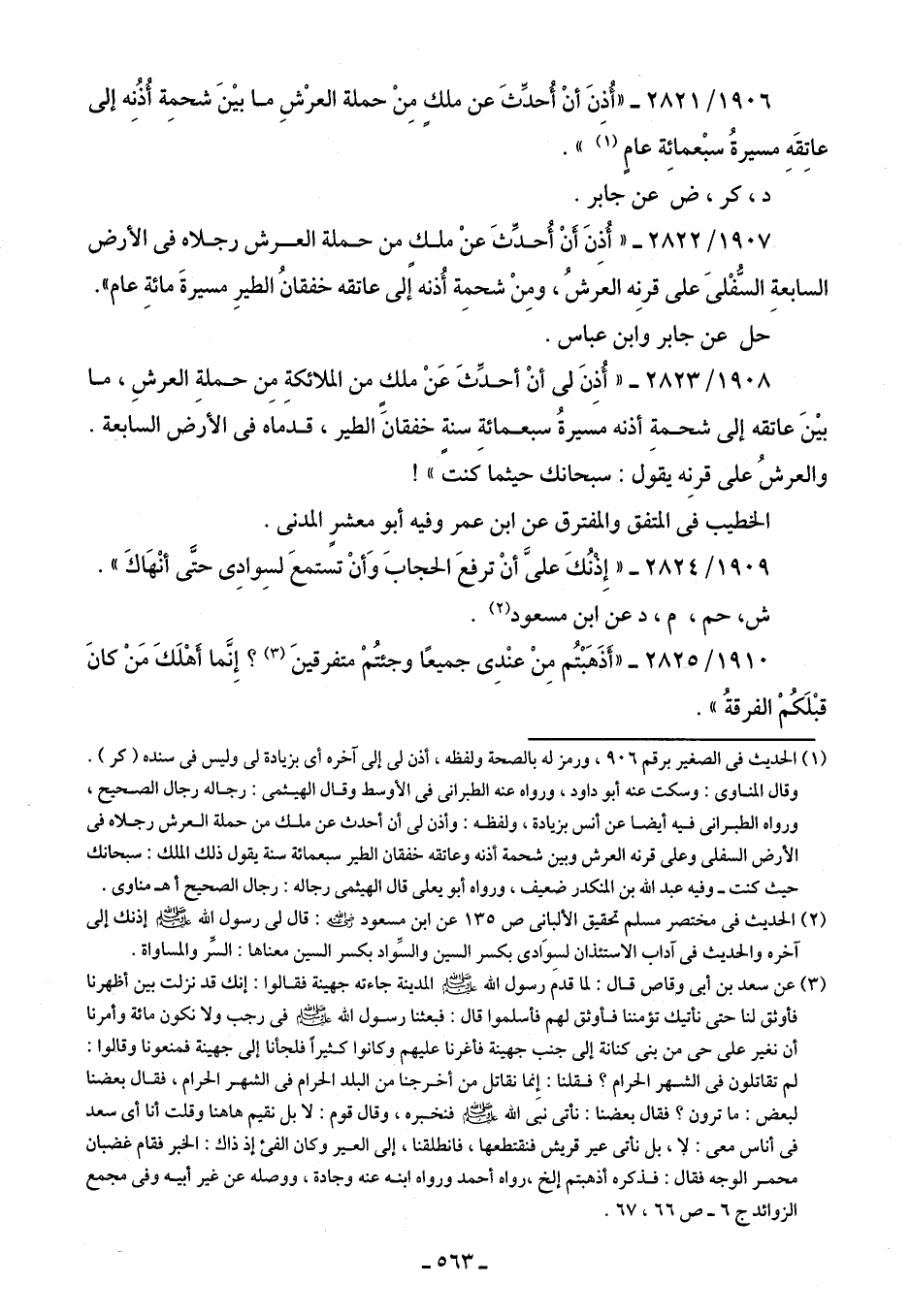 1906/ 2821 - "أُذنَ أنْ أُحدِّثَ عن ملكٍ مِنْ حملة العرْشِ ما بينَ شحمِة أُذُنِه إلى عاتِقَهِ مسيرةُ سبْعمائِة عامٍ (¬1) ".