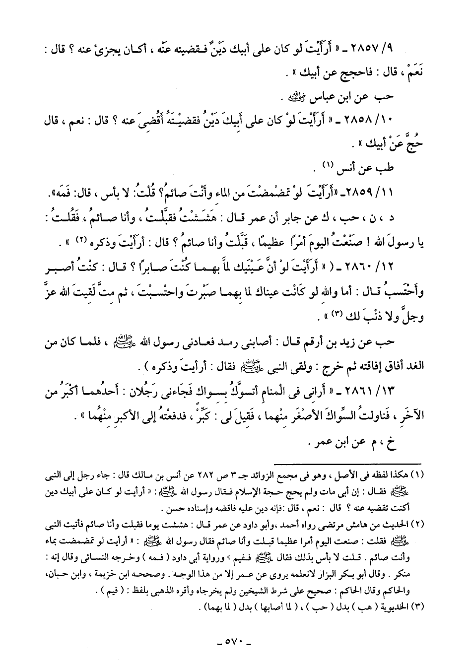 د، ن، حب، ك عن جابر أن عمر قال: هَشَشْتُ فقبَّلتُ، وأنا صائمُ، فَقُلتُ: يا رسولَ الله! صَنْعْتُ اليومَ أمْرًا عظيمًا، قَبَّلتُ وأنا صائمُ؟ قال: أرَأَيتَ وذكره (¬2) ".
