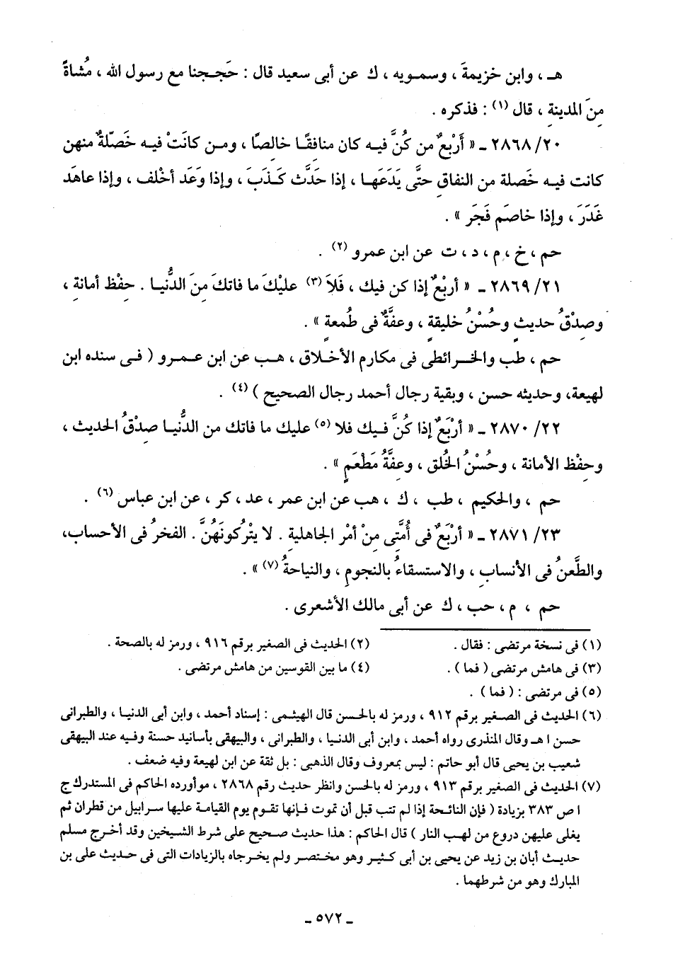21/ 2869 - "أربعٌ إذا كن فيك، فَلَا (¬3) عليكَ ما فاتكَ مِنَ الدُّنيا. حِفْظ أمانةِ، وصِدقُ حديث وحُسْنُ خليقةٍ، وعفَّةٌ في طُمعة".