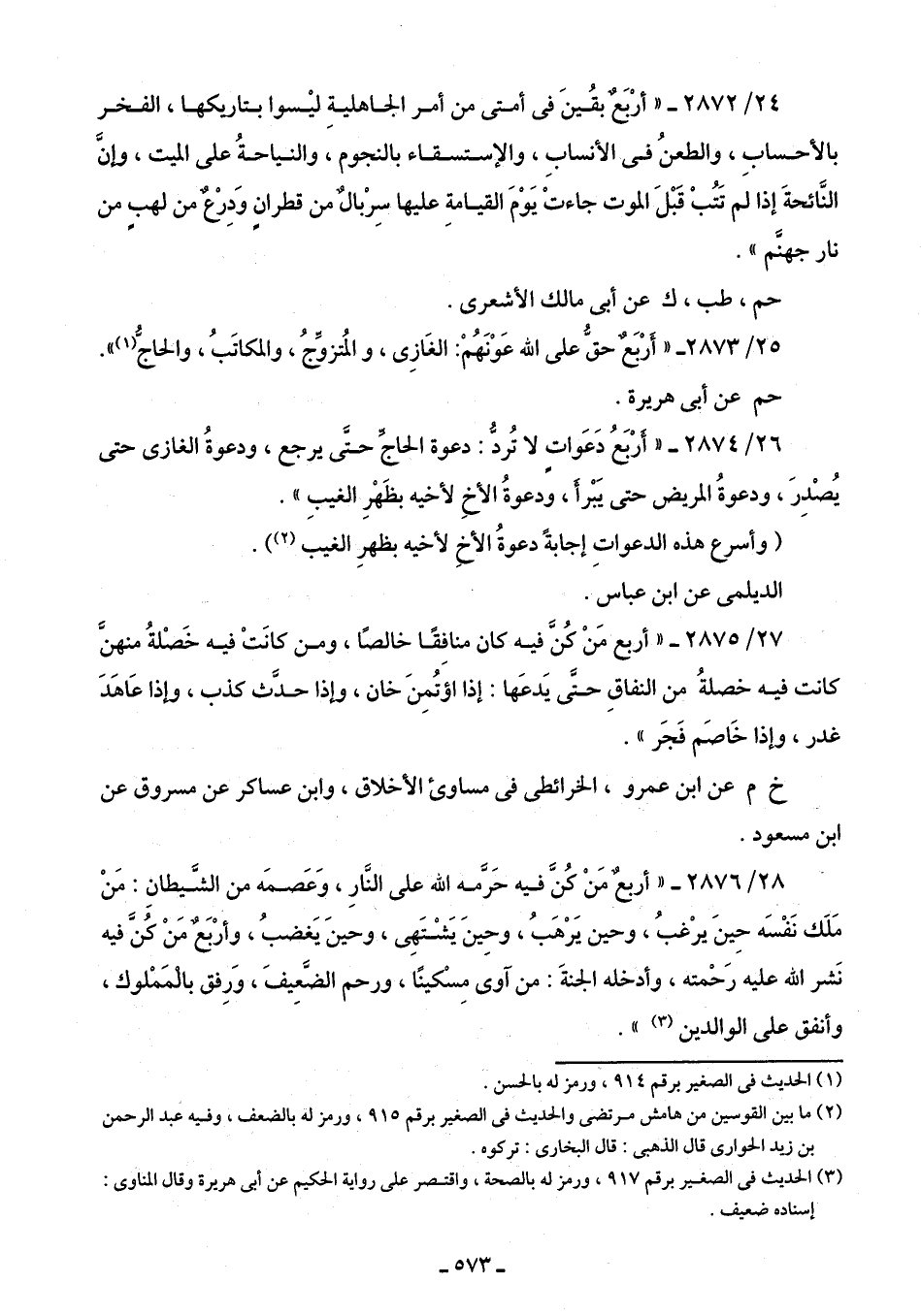 28/ 2876 - "أربعٌ مَنْ كُنَّ فيه حَرَمه الله على النارِ، وَعَصمَه من الشيطانِ: مَنْ مَلَك نَفْسَه حِينَ يرغبُ، وحين يَرهبُ، وحِينَ يَشْتَهِى، وحينَ يَغضبُ، وأربع مَنْ كُن فيه نَشر الله عليه رحمته، وأدخله الجنةَ: من آوى مِسْكينًا، ورحم الضَّعِيفَ، وَرِفق بالمملوك، وأنفق على الوالدين (¬3) ".