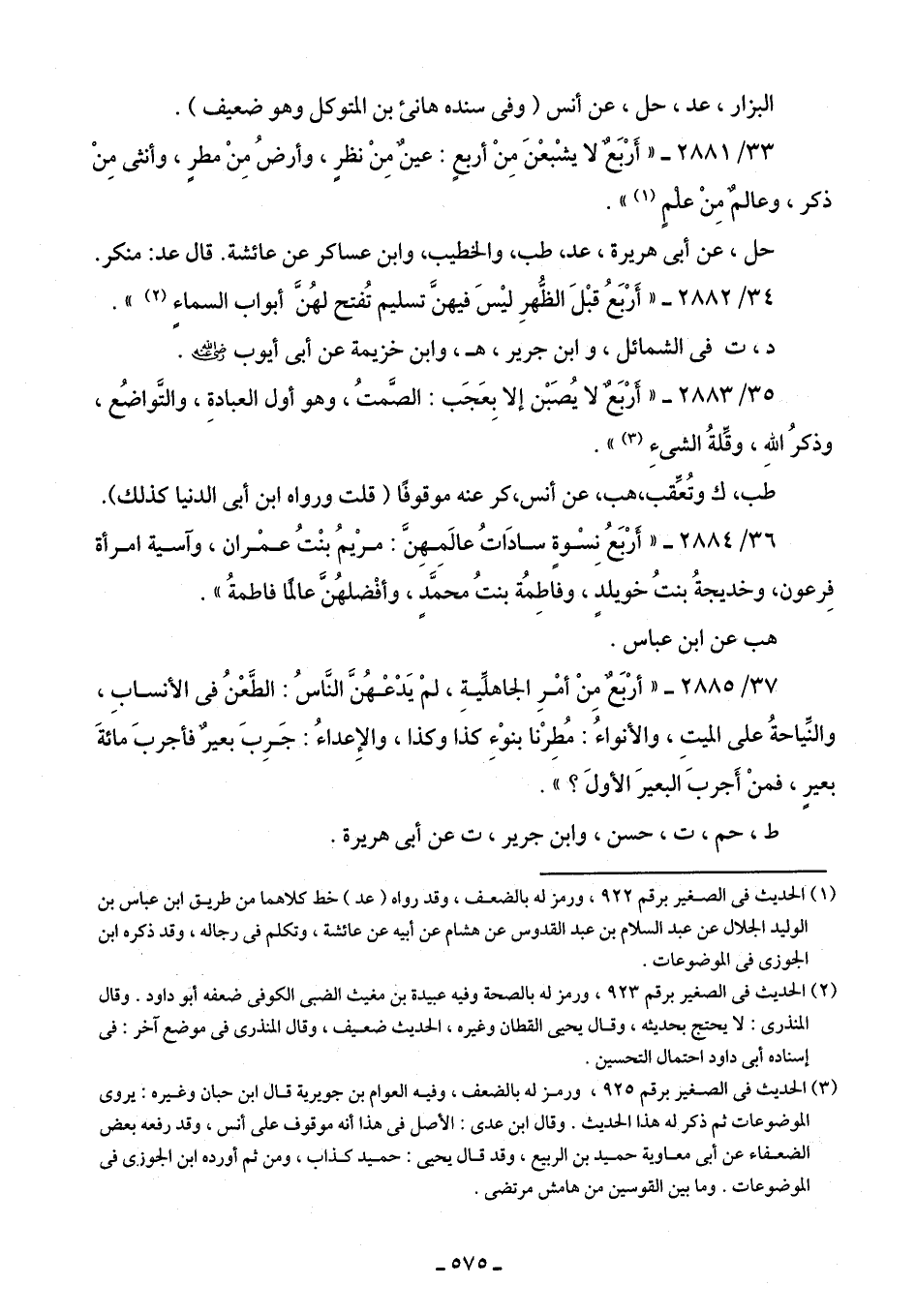 33/ 2881 - "أَربَعٌ لا يشْبعنَ منْ أربعٍ: عينٌ منْ نظرٍ، وأرضُ منْ مطرٍ، وأنثى منْ ذكر، وعالمٌ مِنْ علمٍ (¬1).