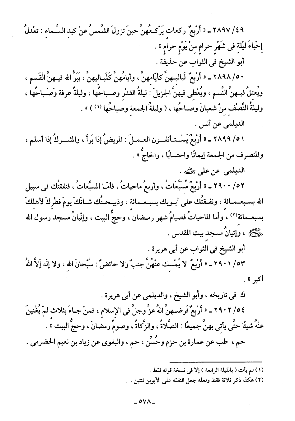 50/ 2898 - "أربعُ لَياليِهنَّ كأيامِهنَّ، وأيامُهنَّ كلَيالِيهن، يَبَرُّ الله فيهنَّ الْقَسم، ويُعتِقُ فيهنَّ النَّسم، ويُعطِى فيهنَّ الجزيلَ: ليلةُ القدرِ وصباحُها، وليلةُ عرفة وَصَباحُها، وليلةُ النِّصفِ مِنْ شعبانَ وصباحُها، (وليلةُ الجمعةِ وصباحُها) (¬1) ".