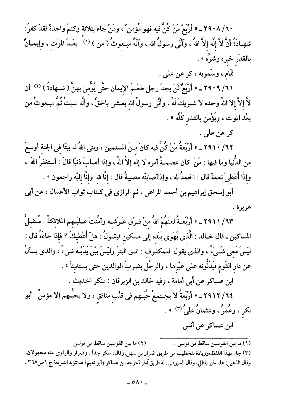 60/ 2908 - "أربعٌ مَنْ كُنَّ فيه فهو مُؤمنٌ، ومَنْ جاء بثلاثةٍ وكتمَ واحدةً فقد كفرَ: شهادَةُ أن لَا إِلَه إِلا اللهُ، وَأنِّي رسولُ الله، وَأَنَّهُ مبعوثُ (من) (¬1) بعدَ الموْتِ، وإِيمانٌ بالقدَرِ خيِره وشرِّه".