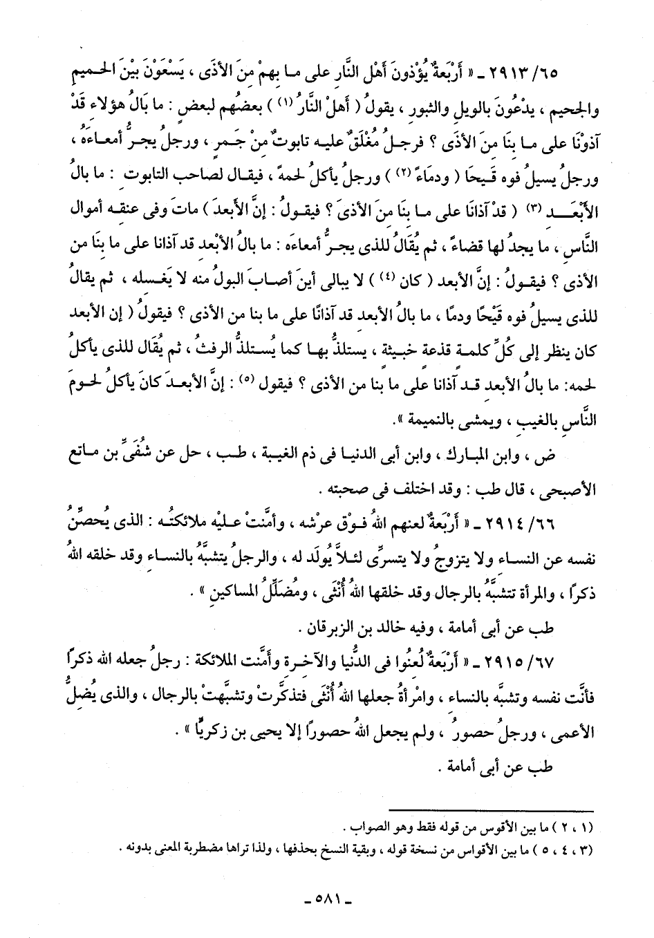 65/ 2913 - "أربَعةٌ يُؤْذونَ أهْل النارِ على ما بِهم مِنَ الأذَى، يَسْعَوْنَ بينَ الحميم والجحيم، يدعُونَ بالويلِ والثبورِ، يقولُ (أَهل النارُ) (¬1) بعضُهم لبعضٍ: ما بَالُ هؤلاءِ قَدْ آذوْنَا على ما بِنَا مِنَ الأذَى؟ فرجلُ مُغْلَقٌ عليه تابوتٌ مِنْ جَمرٍ، ورجلُ يجرُّ أمعاءَهُ، ورجلُ يسيلُ فوه قَيحَا (ودمَاء) (¬2) ورجلُ يأكلُ لحمه، فيقال لصاحب التابوتِ: ما بالُ الأبعَدِ (¬3) (قد آذانَا على ما بِنَا مِنَ الأذى؟ فيقولُ: إنَّ الأبعدَ) ماتَ وفي عنقِه أموال النَّاسِ، ما يجدُ لها قضاءً، ثم يُقَالُ للذي يجرُّ أمعاءَه: ما بالُ الأبْعدِ قد آذانا على ما بِنَا من الأذى؟ فيقولُ: إنَّ الأبعد (كان) (¬4) لا يبالى أينَ أصابَ البولُ منه لا يَغسِله، ثم يقالُ للذي يسيلُ فوه قَيحًا ودمًا، ما بالُ الأبعدِ قد آذانًا على ما بنا من الأذى؟ فيقولُ (إن الأبعد كان ينظر إلى كل كلمة قذعة خبيثة، يستلذُّ بها كما يُستلذُّ الرفثُ، ثم يُقَال للذي يأكلُ لحمه: ما بالُ الأبعدِ قد آذانا على ما بنا من الأذى؟ فيقول (¬5): إنَّ الأبعدَ كانَ يأكلُ لحومَ النَّاسِ بالغيبِ، ويمشى بالنميمة".